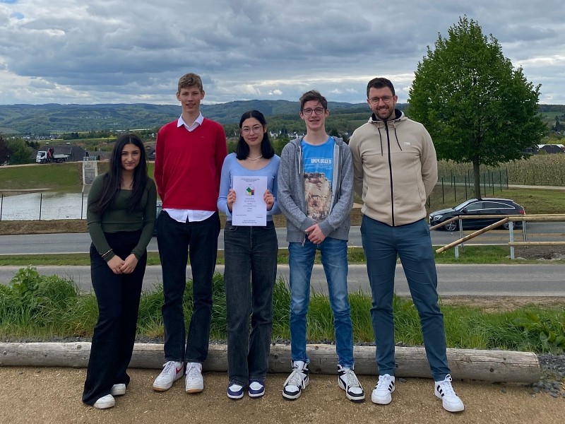 Bei diesem Wettbewerb gelang es der Klasse, einen sensationellen dritten Platz mit nur 0,5 Punkten Rückstand zu den beiden Erstplatzierten zu erreichen. Insgesamt nahmen 17 Schulen und 99 Klassen und Kurse teil. Die Siegerehrung fand am Are-Gymnasium in Bad Neuenahr statt. Das Bild zeigt eine stolze Abordnung der 10b mit ihrem Mathematiklehrer Herr Blaum.
