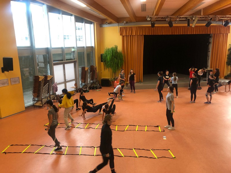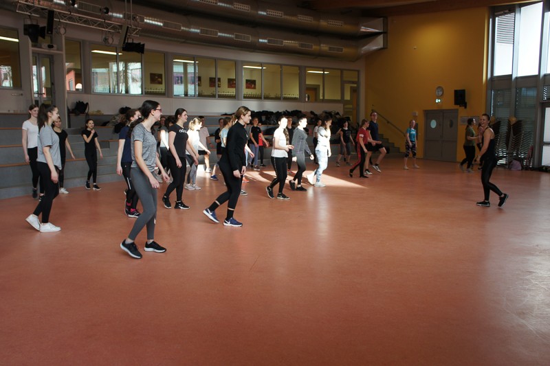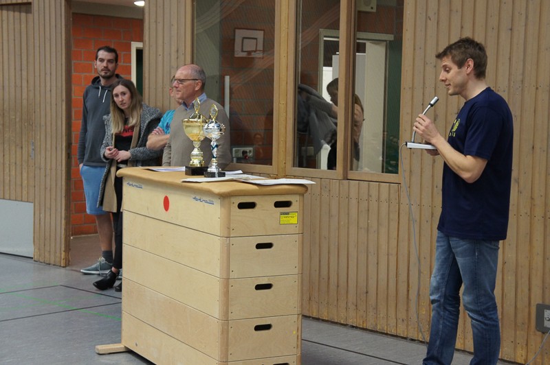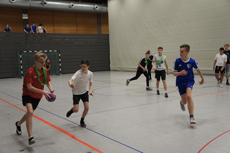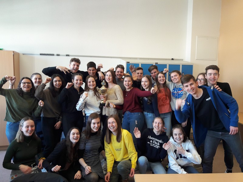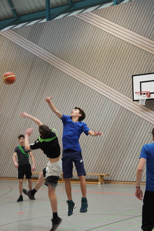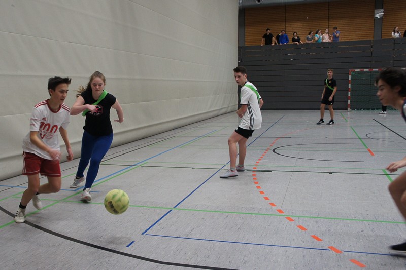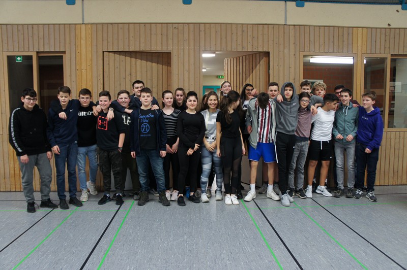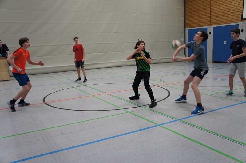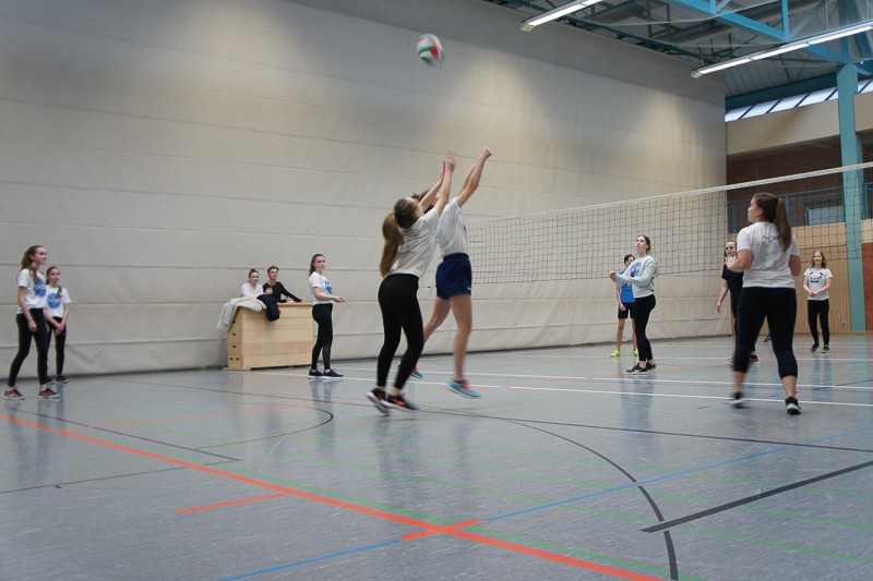 Zuerst müssen immer verschiedene Vorbereitungen, Aufbauten und organisatorische Dinge erledigt werden. Doch die SchülerInnen ließen nicht lange auf sich warten und waren schon teilweise recht zeitig in den Hallen, um sich auf die Sportspiele vorzubereiten. Pünktlich um 13.15 Uhr ging es dann schon fast los: erste Ansagen durchs Mikro machen, wer wann, wo spielt, Schüler sortieren, LK-Schüler als Schiris einweisen usw.Dann konnten die Spiele beginnen: Fußball, Handball, Basketball und Volleyball in den Hallen für die 9./10. Klassen, Fitness-workshop für Tanz- und Bewegungsspezialisten in der Aula. Dort kamen 40 Personen, meist Schülerinnen, ganz schön ins Schwitzen, unter der Anleitung unserer drei fachkundigen Sportlehrerinnen.Beim Spieleturnier entwickelte sich ein enger Kampf zwischen den 9. Klassen, bei dem sich die 9d durchsetzen konnte. Im 10er-Turnier gewann die Klasse 10b. Gegen 16.45 Uhr versammelten sich noch einmal alle SchülerInnen in der neuen Halle, um an der Siegerehrung teilzunehmen.Herzlichen Glückwunsch zum Gewinn des Cups und des dazugehörigen Pokals, gefüllt mit Gummibärchen.