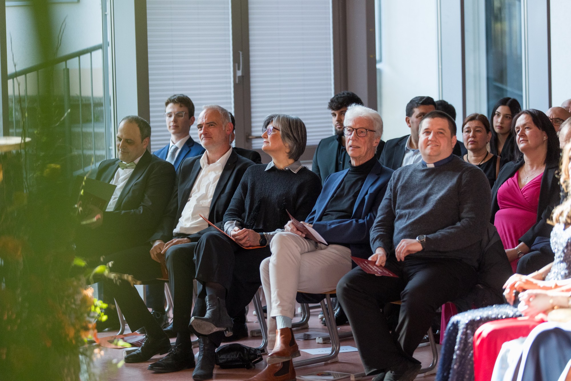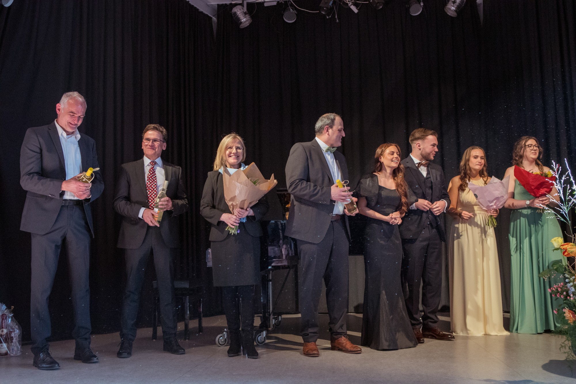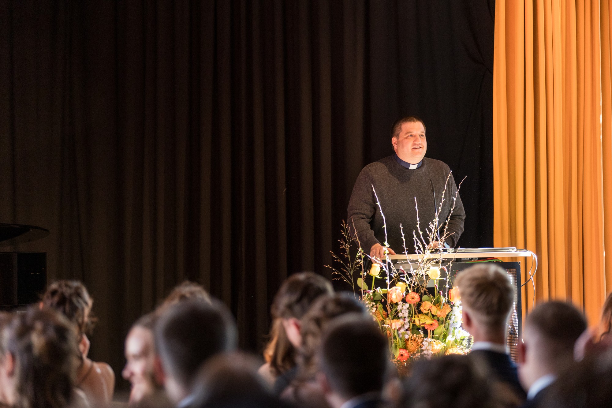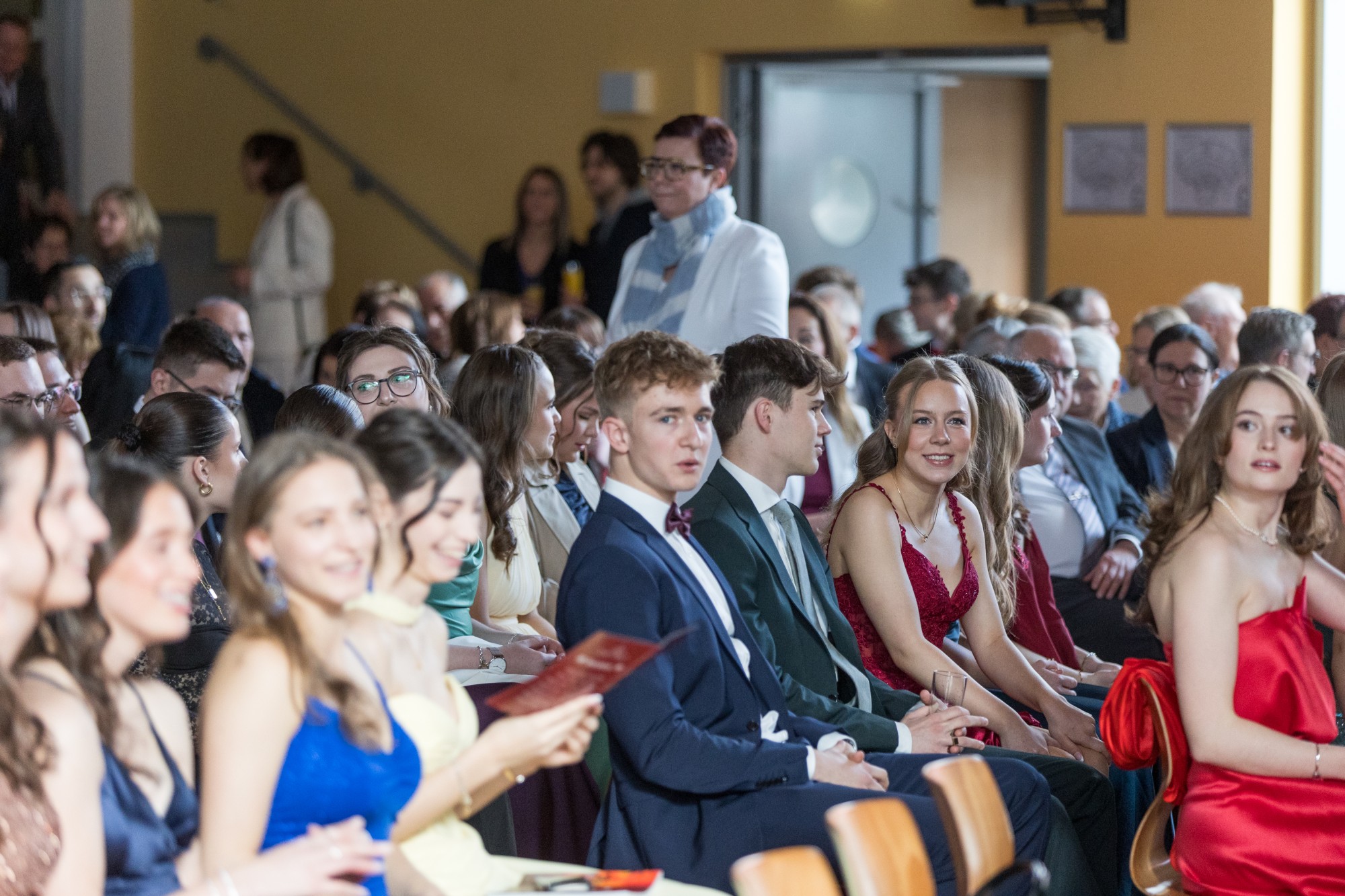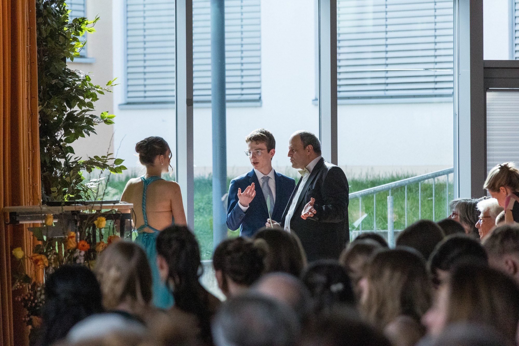Es folgten weitere Gruß- und Dankesworte der Schulelternsprecherin Daniela Duck, des Vorsitzenden des Vereins der Ehemaligen und Förderer des MTG, Rüdiger Klapthor, und der SV, vertreten durch Mátyás Csizmadia, Jonas Kexel, Leonard Lause, Antonia Zinndorf. Pfarrer Steffen Henrich sprach für die beiden christlichen Kirchen und hatte mit seiner humorvollen Art wieder einmal die Lacher auf seiner Seite. Auch eine Videobotschaft des Ministerpräsidenten Alexander Schweitzer wurde präsentiert.