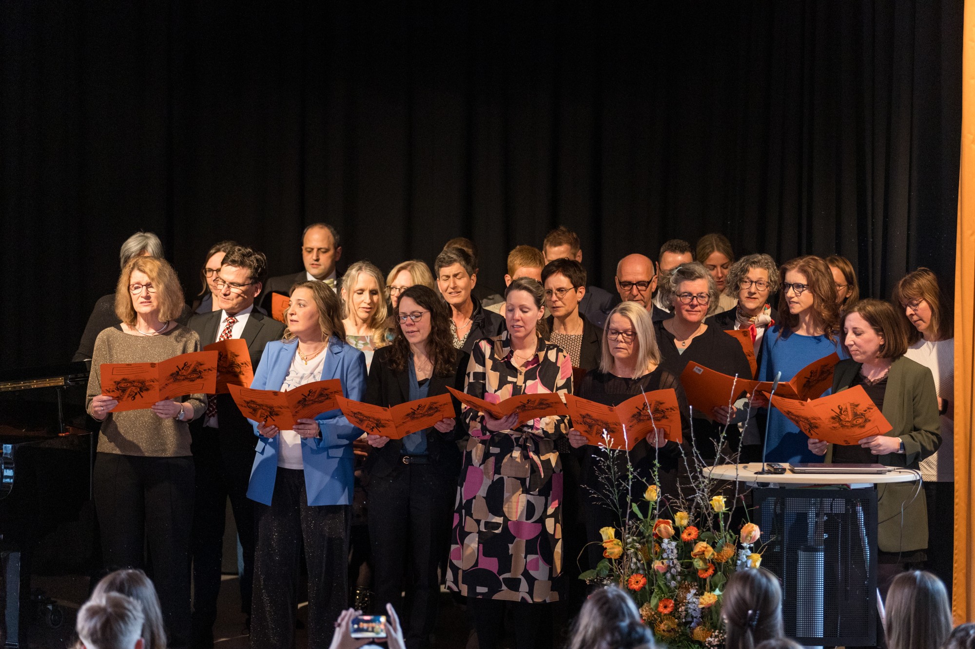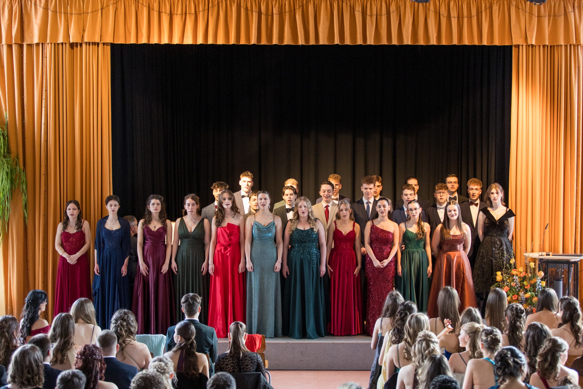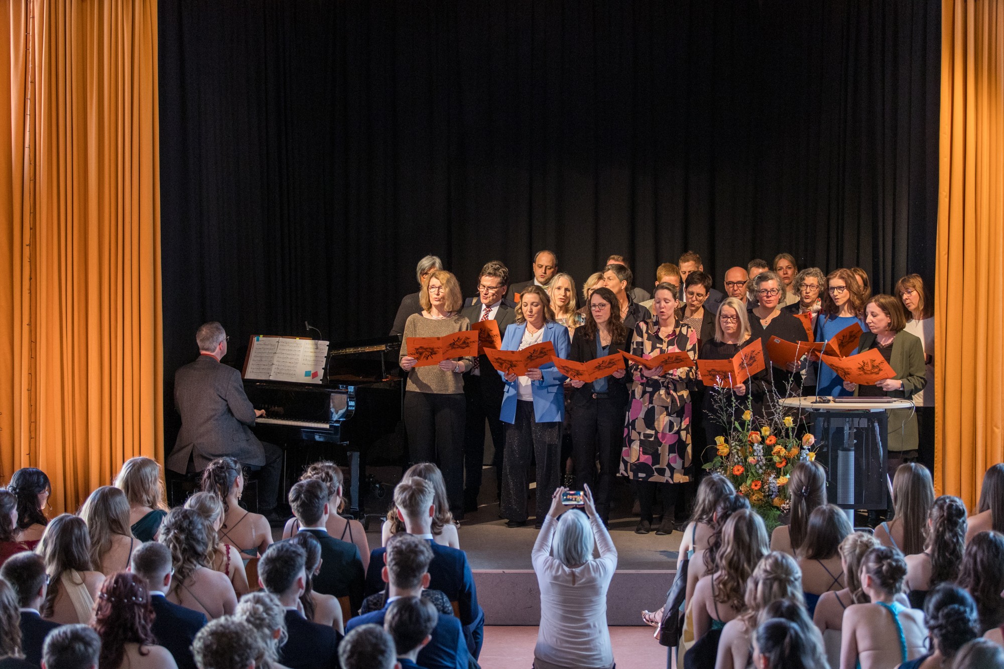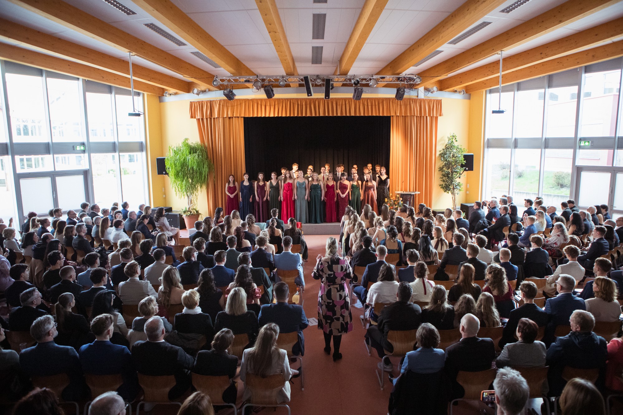 Die Feier startete mit einem Gesangsbeitrag des 13er-Oberstufenchors unter der Leitung von Daniela Dott. Mit den beiden Stücken „Only Time“ (Enya) und „Memories“ (Maroon 5) entstand eine feierliche Stimmung im Publikum.