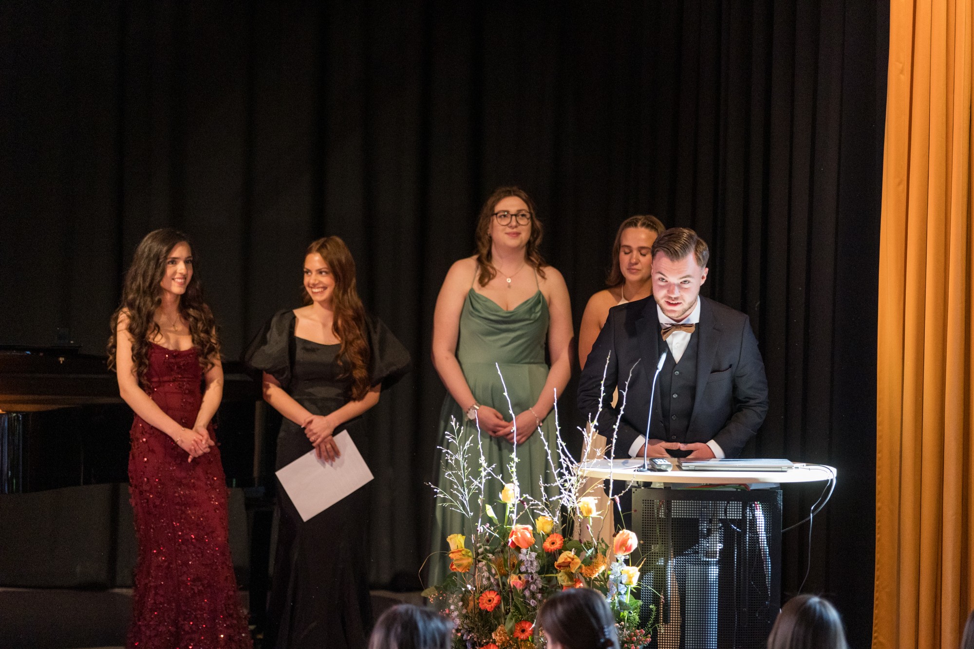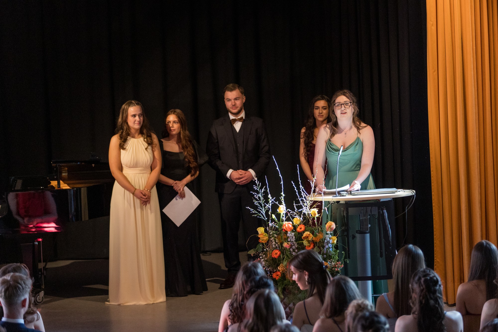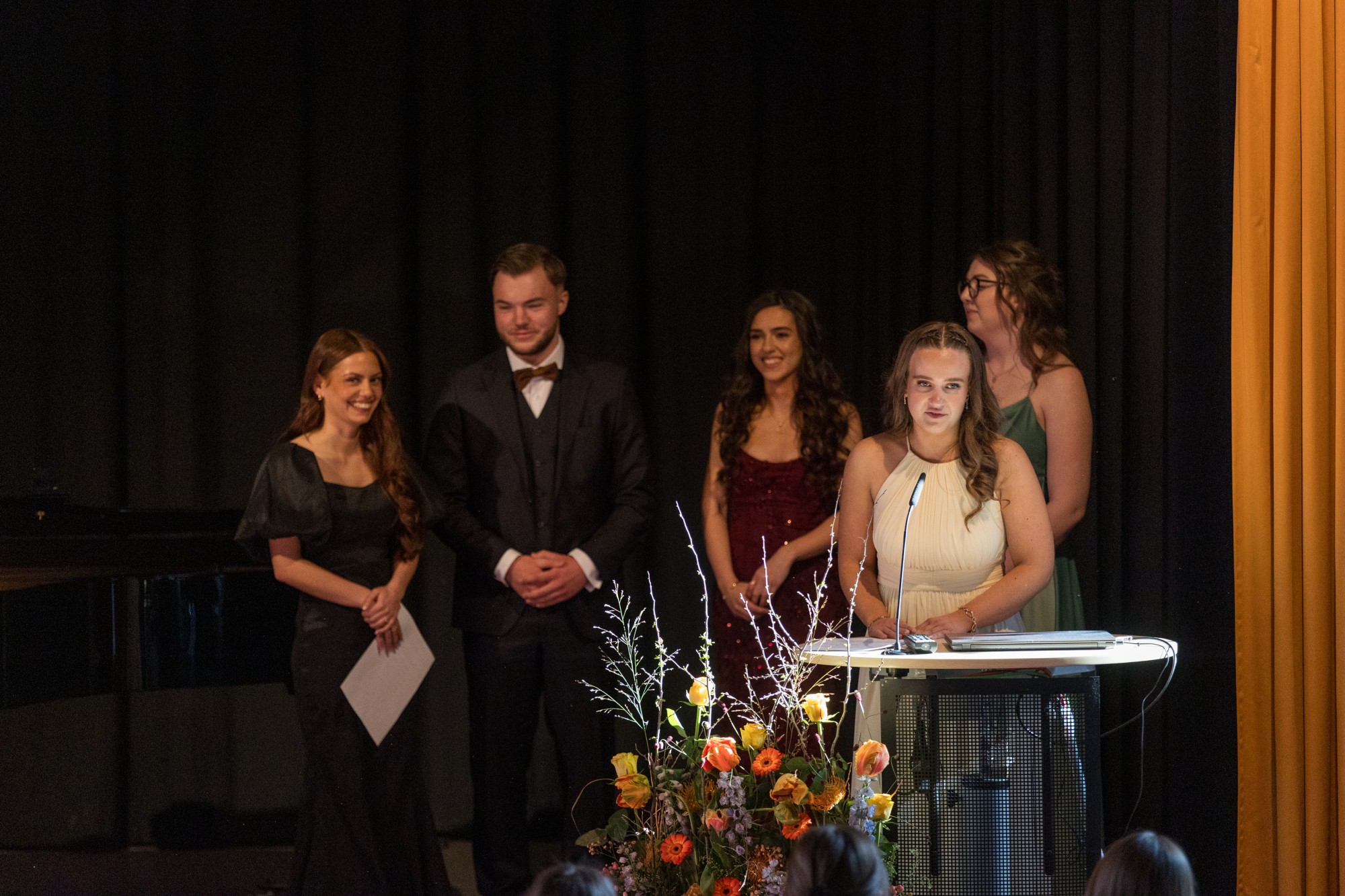Anton Görg, Ilayda Kayaoglu, Franziska Schönberg, Maria Stendebach und Anesa Zhushi hielten die Abschlussrede für den Jahrgang und bedankten sich mit kleinen Präsenten auch bei den schulischen Mitarbeiterinnen und Mitarbeitern, was durch großen Applaus unterstrichen wurde.