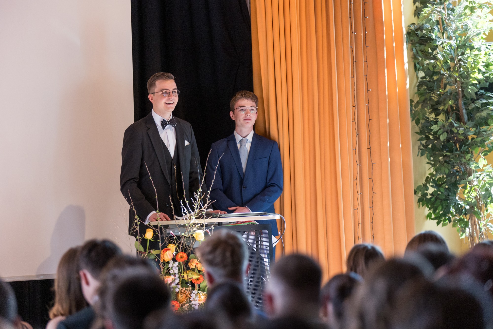 Dann wurde es nochmal offiziell und feierlich zugleich. Vor der Zeugnisausgabe erfolgte die Verleihung der Auszeichnungen für besondere Leistungen. Der Buchpreis des Landrats des Westerwaldkreises ging an Matthias Dennebaum als Jahrgangsbesten. Der Buchpreis des Ministers für vorbildliche Haltung und beispielhaften Einsatz in der Schule wurde an Mátyás Csizmadia vergeben. Er erhielt auch den Buchpreis der Deutschen Vereinigung für Politische Bildung.