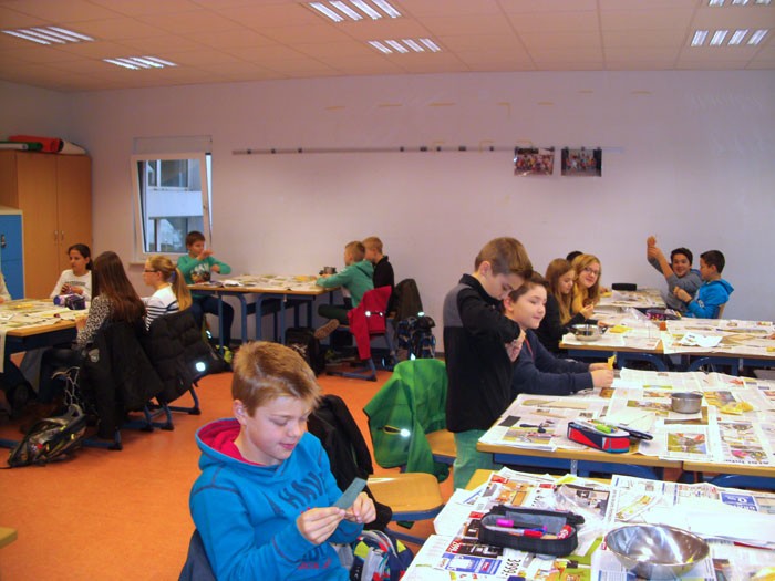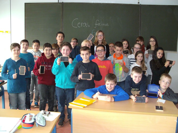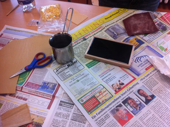 Im Lateinunterricht hatten wir das Thema „Römische Schule“. Da haben wir den Wunsch geäußert, selbst mal römische Schreibmaterialien herzustellen. Wir besorgten uns ein Bastelset, um Wachstafeln zu basteln, wie die Römer sie benutzten.