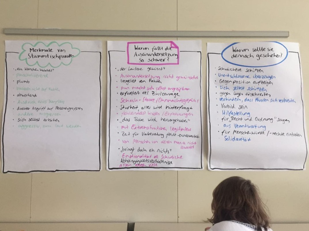 Unter Anleitung der Referenten Fabian Müller und Marvin Müller beschäftigten sich die Teilnehmer nicht nur theoretisch mit Vorurteilen und Stammtischparolen, sondern erfuhren dies in Rollenspielen am eigenen Leib. Während die diskutierten Themen sehr komplex sind, handelt es sich bei Parolen um einfache Aussagen, die die Realität nur verkürzt wiedergeben. Zwar steckt in Stammtischparolen meist ein Funken Wahrheit, doch sind sie plump, abwertend und basieren nicht auf Fakten (siehe Foto).