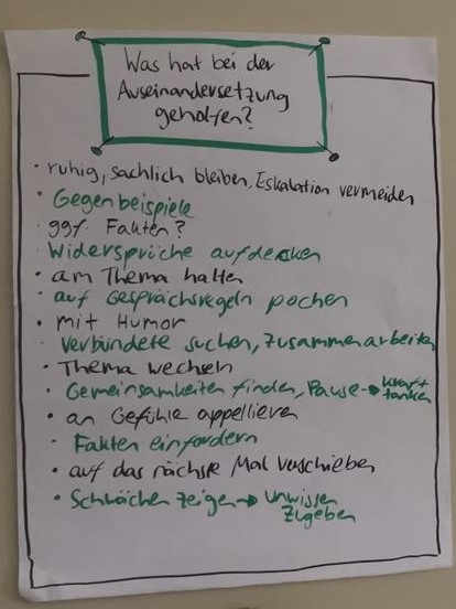 Spannend wurde es, als die Workshopbesucher gemeinsam mit Fabian und Marvin nach Wegen aus der Ohnmacht suchten, um den Parolen mutig entgegen zu treten. Hilfreich ist es hierbei, Fakten einzufordern, Widersprüche aufzudecken, mit Humor zu agieren und dabei ruhig und sachlich zu bleiben, um so eine Eskalation zu vermeiden. Auch dies wurde in konkreten Situationen angewendet, um z. B. die Spannung zwischen reinen Informationen und Gefühlen aufzuzeigen und ein Belehren mit erhobenem Zeigefinger zu verhindern (Stichwort: kognitive Dissonanz). In diesem Zusammenhang können die drei Regeln des Distanzierens hilfreich sein (siehe Foto).