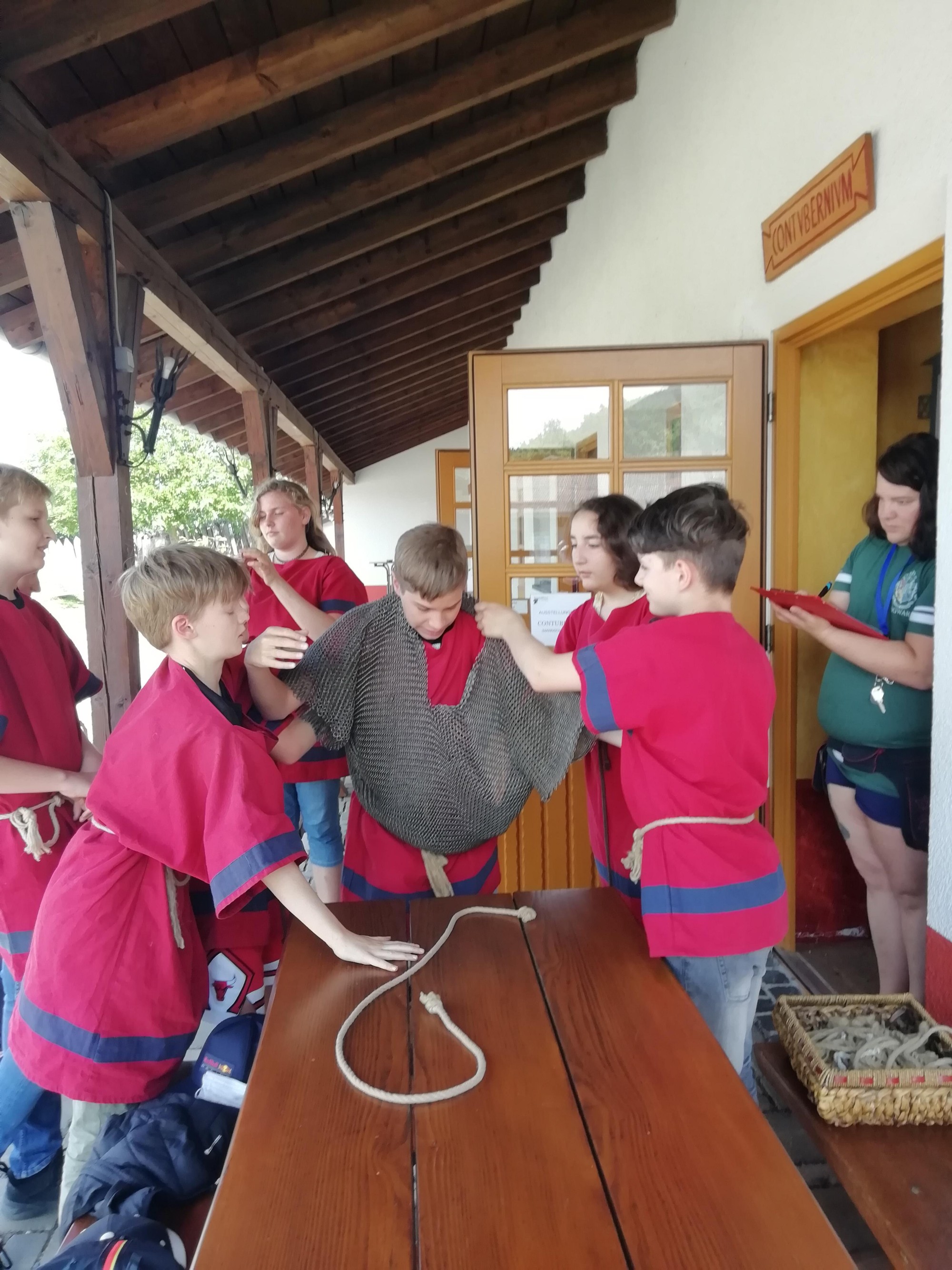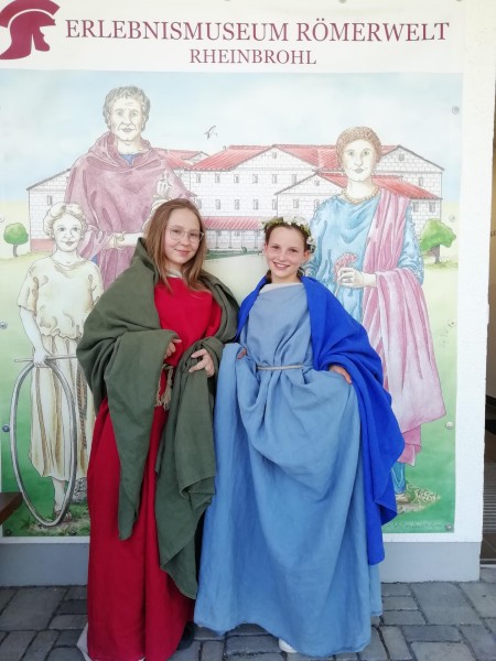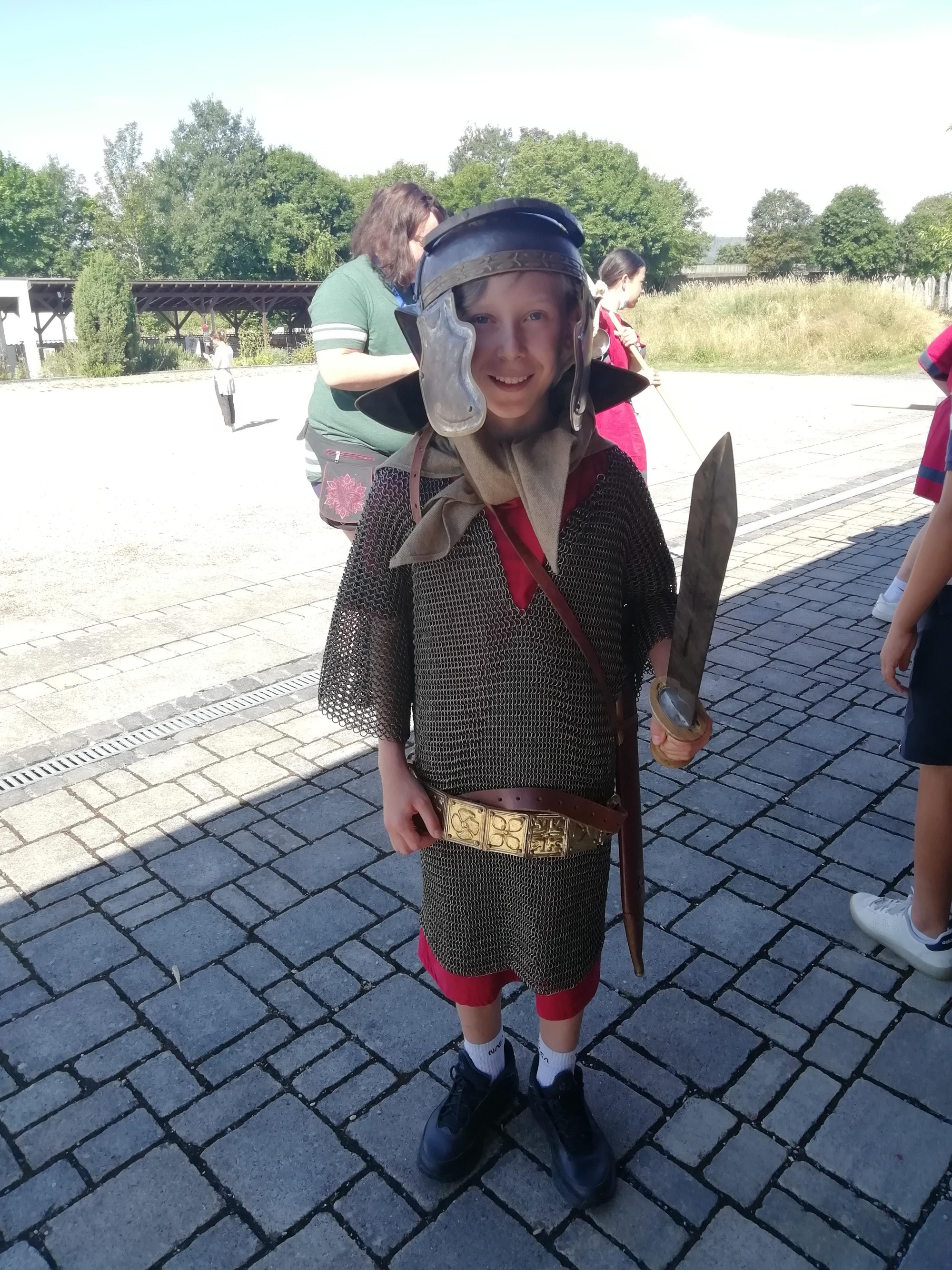 Als erstes wurden wir freundlich empfangen und uns wurde erklärt, was uns Spannendes bevorstand und meine Vorfreude wurde größer. Dann ging es endlich los. Eine interessante Museums-Tour am Anfang ließ mich direkt in die Welt der alten Römer eintauchen. Ich war fasziniert, was das Museum alles zu bieten hatte. Neben einer großen Karte, die uns zeigte wie groß und mächtig das Römische Reich wirklich war, gab es auch noch Kleidung. Ja genau, aber nicht welche zum Anschauen, sondern zum Anziehen. Echte römische Kleidung. Für die Jungen ein Soldaten Hemd und ein wunderschönes römisches Kleid für die Mädchen. Dann haben wir schöne Bilder gemacht in einer Nachbildung eines römischen Pferdewagens.