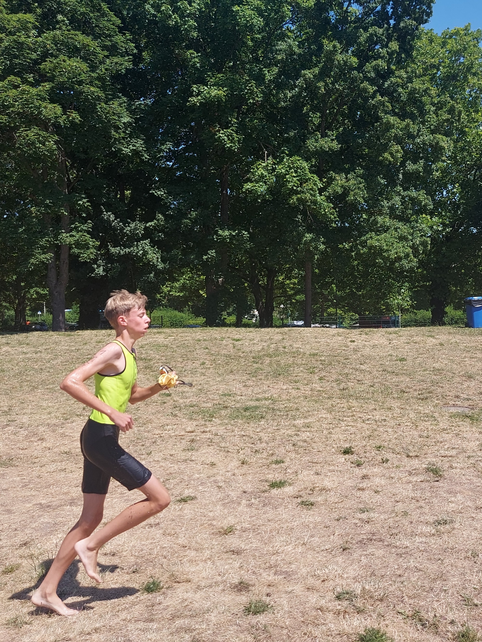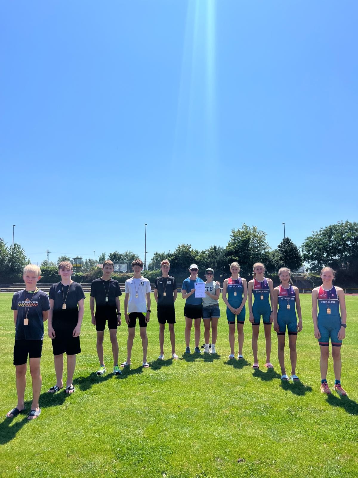 Im Freibad in Bad Bergzabern starteten die SchülerInnen in der brütenden Mittagshitze unter freiem Himmel und zeigten schon beim 200 m-Schwimmen, dass sie das Feld dominierten. Mit schnellen Schritten ging es in die Wechselzone, wo die geübten SportlerInnen in die Laufschuhe schlüpften und auf ihre Mountainbikes stiegen, um die 3 km lange Radstrecke zu absolvieren. Auch hier blieb das Team dicht beieinander, ohne dass sie sich das verbotene Windschattenfahren zunutze gemacht hätten. Im bis dahin noch leeren Stadion liefen nach erstaunlich kurzer Zeit erst die Mädels fast geschlossen ein, dicht gefolgt von den Jungs der Mannschaft des MTGs. In beeindruckendem Tempo schossen lange Beine zwei Runden lang die 800 m bis ins Ziel. Eine grandiose Leistung bei Temperaturen von über 30 Grad. Trotz der Hitze, die dem Körper noch mehr abverlangt, kamen alle SportlerInnen gesund ins Ziel. Außer Konkurrenz und als wichtiger Ersatzmann und Unterstützung finishte Valentin Gilb mit einem respektablen Ergebnis.