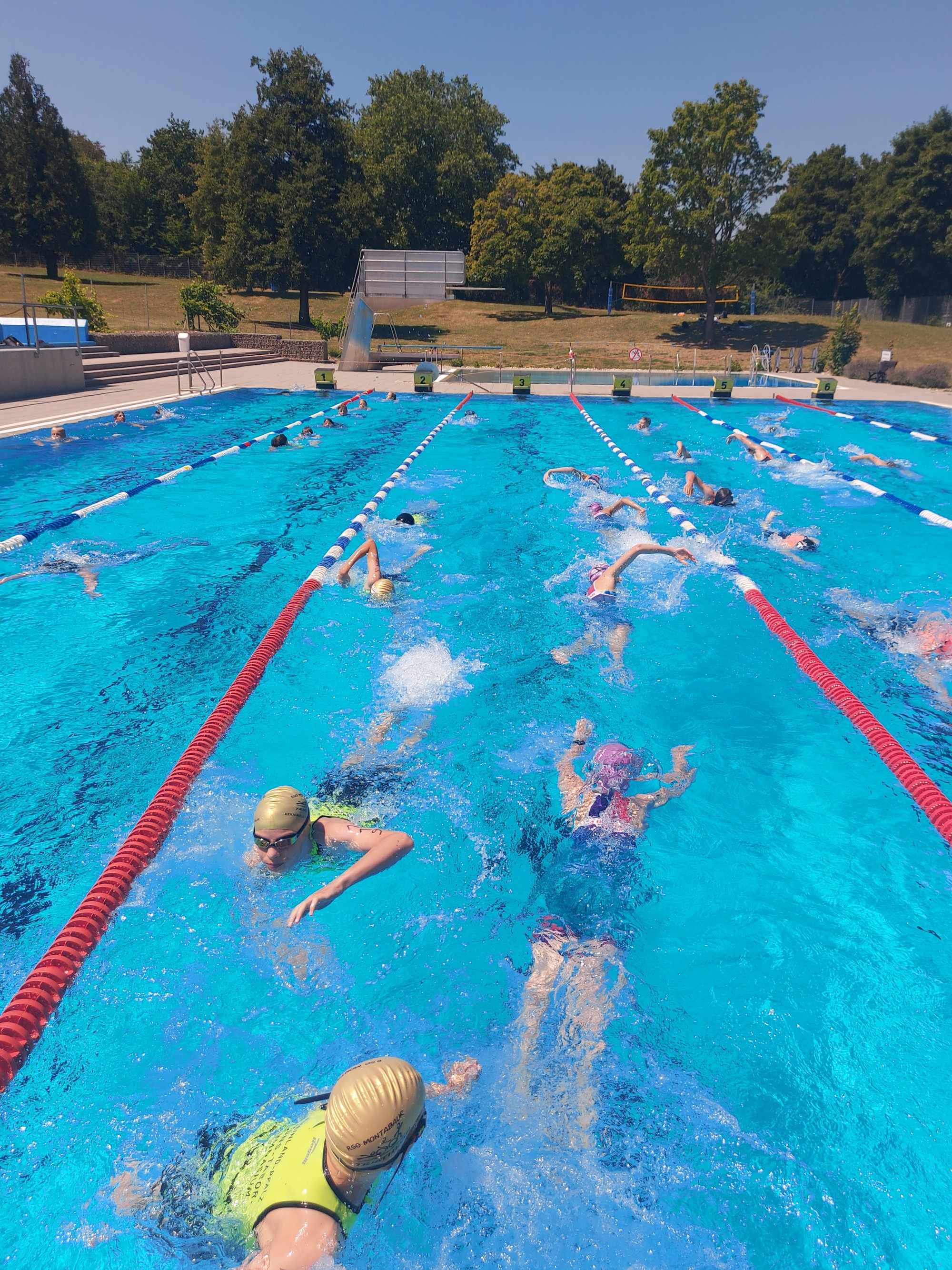 Sommer, Sonne, Freibad – was nach Erholung klingt, waren tatsächlich die Wettkampfbedingungen am Montag, den 30.6.25 beim Landesentscheid Jugend trainiert für Olympia in Bad Bergzabern. Die Mannschaft des MTG, bestehend aus Juna Bäcker, Charlotte Schütz, Pauline Solbach, Ida Wendland sowie Janne Dötsch, Jannis Güllering, Leo Pabst und Conrad Zühlke qualifizierte sich mit über acht Minuten Vorsprung vor dem zweitplatzierten Max-Plank Gymnasium Trier für das Bundesfinale im September in Berlin.