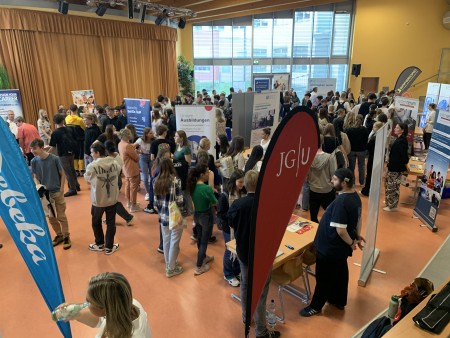 Ein besonderes Highlight war in diesem Jahr die kleine Berufsmesse, die zum ersten Mal im Vorfeld der Vortragsrunden stattfand. Viele der teilnehmenden Betriebe, Hochschulen und Organisationen nahmen dieses Novum sehr gerne an. In einer sehr positiven, lebendigen Atmosphäre nutzten zahlreiche Schülerinnen und Schüler die Chance, sich über die vielfältigen beruflichen Möglichkeiten und Perspektiven einiger – vor allem regionaler – Anbieter zu informieren und wertvolle Kontakte zu knüpfen.