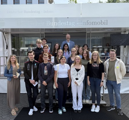 Am 11. Juni hatten Schülerinnen und Schüler der Jahrgangsstufen 11 und 12 die Gelegenheit, das Infomobil des Deutschen Bundestages zu besuchen, das an diesem Tag auf dem Bahnhofsplatz in Montabaur Station machte.