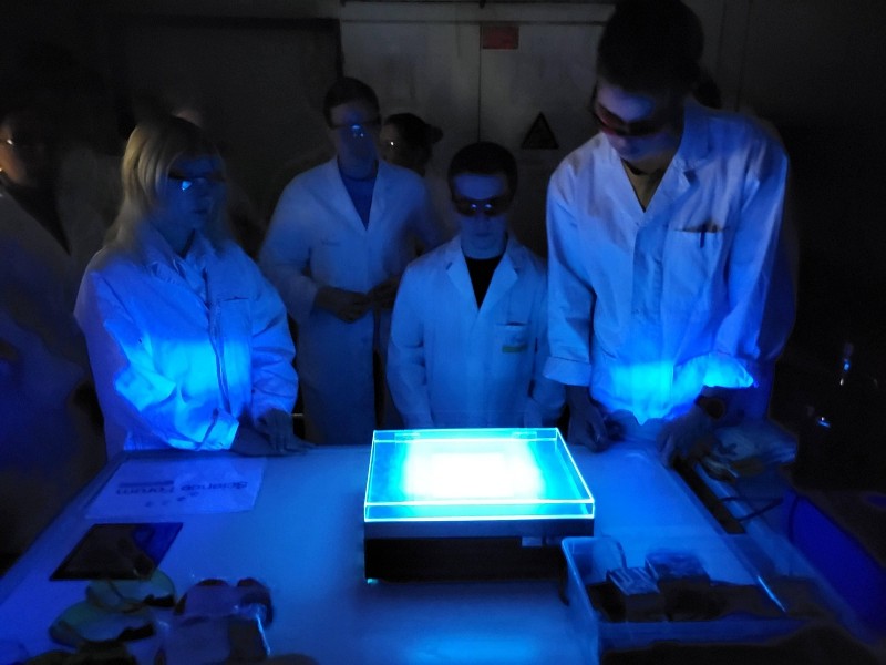 Zu Beginn wurden wir von Dr. Führ und seinen Studenten im Science Forum empfangen, wo spannende Experimente zur Kriminalistik auf uns warteten. Nach einer kurzen Einführung ging es für uns direkt ins Labor, wo die Studenten verschiedene Stationen für uns vorbereitet hatten.Ein Experiment bestand daraus, zu erfahren, woraus ein unbekannter Stoff besteht, der beispielsweise an einem Tatort gefunden wird. Dazu lösten wir diesen in Salz- bzw. Schwefelsäure. Je nachdem, in welcher Flüssigkeit der Stoff sich löste, konnte man dadurch genauer auf seine Zusammensetzung schließen. An einer anderen Station wurde uns nähergebracht, durch welche Verfahren Blut an einem Tatort sichtbar gemacht werden kann.Ein besonderes Highlight war die Gelelektrophorese, die wir in zwei verschiedenen Grupppen unter Anleitung der Studenten selbstständig durchführen durften. Dieses Analyseverfahren ermöglicht es, verschiedene DNA-Proben zu vergleichen. In der Kriminalistik speziell kann man dadurch zum Beispiel herausfinden, ob Proben des Tatorts von mutmaßlichen Tätern stammen. Nach gemeinsamen Mittagessen in der Mensa schauten wir uns die Ergebnisse der Gelelektrophorese unter UV-Licht an und überprüften die verschiedenen DNA-Proben auf Übereinstimmungen. Der Besuch im Science Forum hat uns sehr viel Spaß bereitet, vor allem, da wir neue Experimente durchführen konnten, die in der Schule aufgrund des zeitlichen Umfangs bzw. der benötigten Materialien und Geräte nicht durchführbar sind. Nach diesem spannenden Einlick in die Didaktik in der Chemie sind wir anschließend zwei Stockwerke tiefer durch die Analytik der Chemie geführt worden. Hier wurde uns über gerade laufende Forschungsprojekte berichtet und wir durften uns sowohl ein Massenspektrometer als auch ein High Performance Liquid Chromatography (HPLC) anschauen. Außerdem erzählte uns ein Student über seinen Arbeitsalltag im Labor und beantwortete uns aufkommende Fragen über den Ablauf des Chemiestudiums. Zum Schluss unseres Besuches der Uni Siegen machten wir noch einen Abstecher in die Universitätsbibliothek, woraufhin wir kurze Zeit später auch schon unseren Heimweg antraten. Ein großer Dank geht an Dr. Führ und seine Studenten für diesen spannenden Einblick in die Chemie.