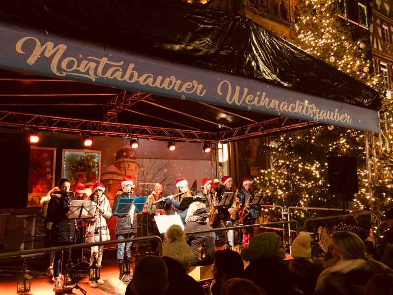 Die Bläserklasse 6a spielte auf dem Weihnachtsmarkt in Montabaur und konnte dabei ihr selbstgestaltetes Fenster am Alten Rathaus erleuchten. Unterstützt von einigen Mitgliedern der kleinen Bigband wurden klassische Weihnachtslieder wie Alle Jahre wieder, O du fröhliche aber auch Lieder wie Jingle Bells, We Wish You a merry Christmas und A Holly Jolly Christmas aufgeführt. Alles in allem ein gelungener Auftritt, der mit einer Waffel und einem Kinderpunsch auf dem Weihnachtsmarkt abgerundet wurde.