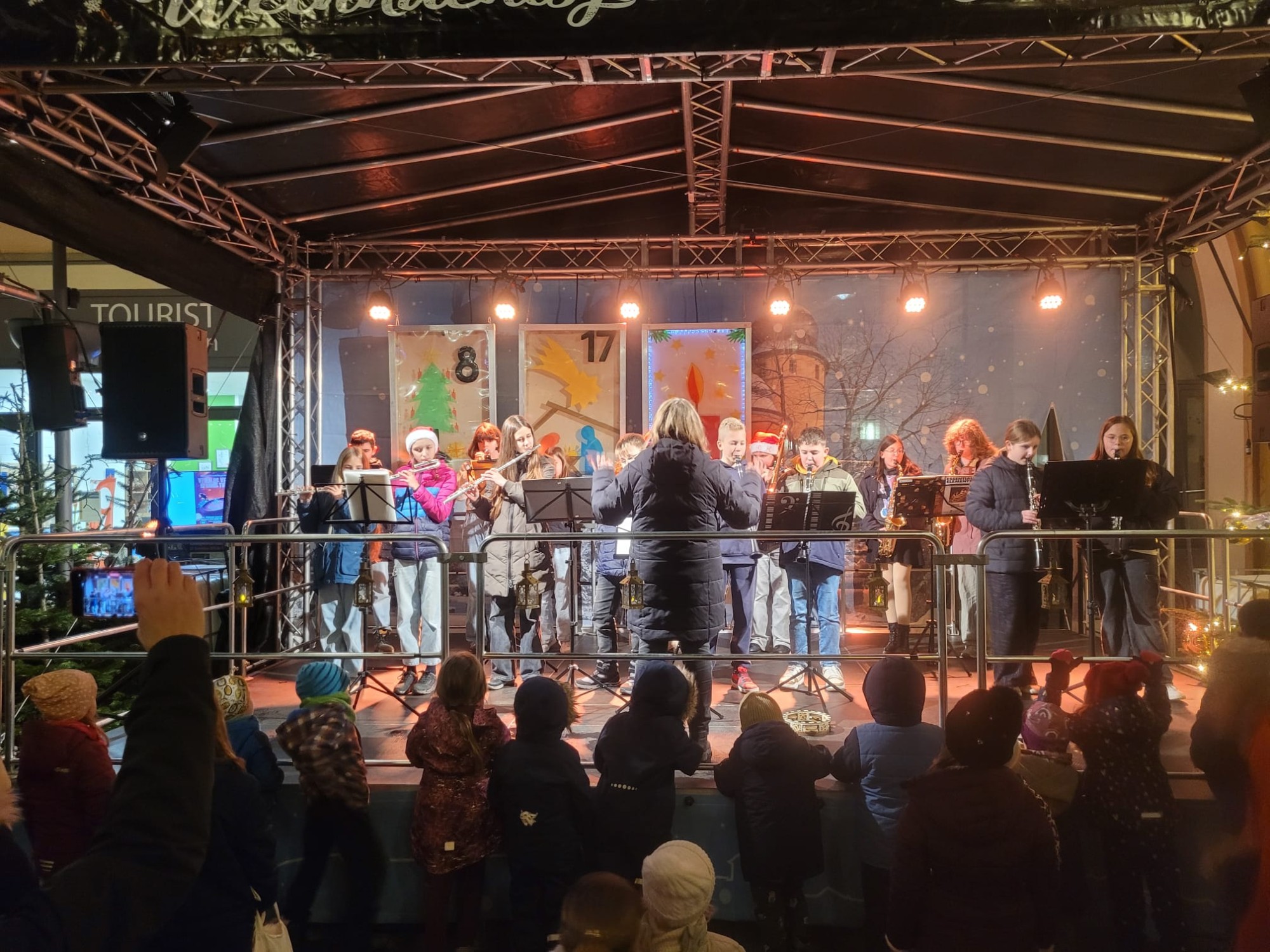 Hinter der Bühne bekamen wir als Dankeschön eine Tafel Schokolade und einen Gutschein für einen Weihnachtsmarktstand. Wir waren sehr stolz auf uns. Es war ein sehr schöner Abend auf dem Weihnachtsmarkt.