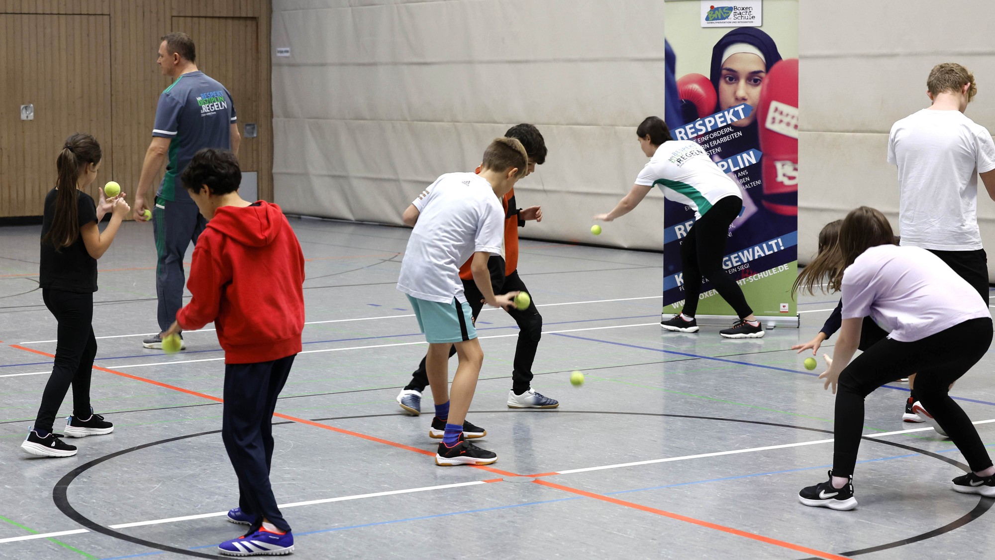 Es braucht Geschicklichkeit, um einen Tennisball aufspringen zu lassen und nach einer angedeuteten Führhand wieder einzufangen. Vor allem, wenn man darin wenig Übung hat. Sowie etwas Mut, um die fortgesetzten Schläge eines Partners zum Körper mit den Handschuhen zu blocken, ohne zurückzuweichen. Beide Tugenden sind für Jan Meurer aber nicht nur im Boxen, sondern auch für die Entwicklung der Persönlichkeit relevant. Darum mutet der Übungsleiter den vierzehn Schülerinnen und Schülern des Mons-Tabor-Gymnasiums in Montabaur diese Übungen so gern zu. Jeden Mittwoch von kurz vor drei bis gegen vier, wenn ihnen die Hälfte der benachbarten Sporthalle zur Verfügung steht.