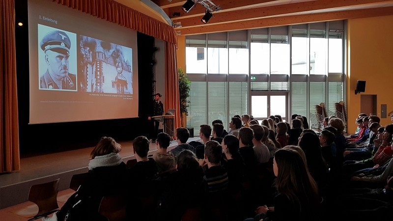 Jakob Saß aus Berlin verstand es im Vortrag besonders gut, seine Begeisterung für das Fach Geschichte weiterzugeben, und lud die Zuhörer dazu ein, seine eigene spannende Entdeckungsreise auf den Spuren des wohl schrecklichsten Westerwälders der Geschichte mitzuerleben. Der in Siegen geborene und ab seiner frühesten Jugend in Hachenburg lebende Bäcker Adolf Haas machte nach seiner Zeit als Kolonialsoldat in der deutschen Kolonie Tsingtau (China) und in japanischer Kriegsgefangenschaft als „Konjunkturritter“ in der NSDAP und der SS eine schnelle, ja atemberaubende Karriere. Schon in der Pogromnacht 1938 eine treibende Kraft in den Aktionen gegen jüdische Mitbürger, z.B. in Mogendorf, stieg er auf zum Kommandanten der Konzentrationslager Niederhagen (Wewelsburg) und Bergen-Belsen. Letzteres ist durch den Tod von Anne Frank für viele Jugendliche bekannt geworden. Überall, wo Haas wirkte, war er für Tod und Leid in erschreckender Weise verantwortlich. Der Referent bezog sein junges Publikum interaktiv in zwei Übungen zur historischen Bildanalyse und zur Entzifferung des in deutscher Kurrentschrift verfassten Lebenslaufs ein, was spürbar zur Belebung der Veranstaltung beitrug. Besonderes Interesse fanden seinen abschließenden Ausführungen zu Haas‘ Verbleib nach dem Zweiten Weltkrieg, der für Saß Anlass zu weiteren Nachforschungen bietet.