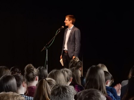 In „Der Tag X“ geht es um die Geschichte des jungen Mädchens Nelly, die sich dem sozialistischen System in der DDR nicht anpasst und versucht, ihren eigenen Weg in einem beengenden Umfeld zu gehen. Bereits als Kind bekommt Nelly mit, wie ihr Vater nachts von sowjetischen Soldaten abgeführt wird und ihre Welt bricht zusammen. Gegen Ende ihrer Schullaufbahn lernt sie dann einen jungen Mann kennen, der, fasziniert von Nellys Persönlichkeit, alles für sie tun würde, auch als Nelly auf einer Schulveranstaltung von der FDJ ausgeschlossen und nicht zum Abitur zugelassen wird, weil sie einer verbotenen kirchlichen Jugendorganisation angehört. Diese fiktive Handlung ist eingebettet in die Ereignisse rund um den 17. Juni 1953, der Tag des Aufstandes in der DDR. Der Autor ist selbst als Berliner in der DDR aufgewachsen, weshalb ihn dieser Roman auch persönlich betrifft. So erzählte er uns immer wieder aus seinem eigenen Leben und beschrieb, wie er die DDR in seinen Augen als Kind und später als Jugendlicher wahrgenommen hat. Dieser Wechsel von biographischen Erzählungen und Lesung aus dem Roman war eine gelungene Abwechslung. Nachdem Titus Müller uns sein Buch vorgestellt und von seiner Kindheit zu Zeiten der DDR erzählt hatte, ging er auf unsere Fragen ein, die sich hauptsächlich um seinen Beruf als Autor drehten. Er erzählte uns beispielsweise, dass er sich sein geschichtliches Hintergrundwissen mithilfe alter Polizeiakten in Archiven aneignet, in spezielle Bibliotheken geht und manchmal für seine Geschichten um die ganze Welt reist. Titus Müller hat bisher 12 Bücher geschrieben und für jedes Buch brauchte er ungefähr ein bis zwei Jahre. Uns hat die Vorlesung von Titus Müller zu seinem Buch „Der Tag X“ vor allem deshalb begeistert, weil er uns einen wichtigen Teil deutscher Geschichte nahegebracht und anschaulich gemacht hat. Seine Begeisterung für dieses Thema und seinen Beruf waren stets spürbar.
