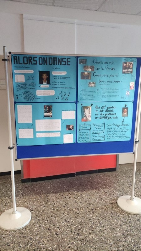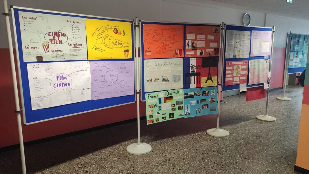 Eine weitere Aktion war die zweisprachige Ausstellung im Lichthof, die über Möglichkeiten der deutsch-französischen Zusammenarbeit in Austauschen, Arbeit und Studium informierte. Weitere kreative Plakate thematisierten französische Musik, französische Kulinarik, Literatur und Geschichte. Untermalt wurde der Tag in den großen Pausen mit französischer Musik, die einige Schülerinnen und Schüler zum Mitwippen auf dem Schulhof veranlasste.