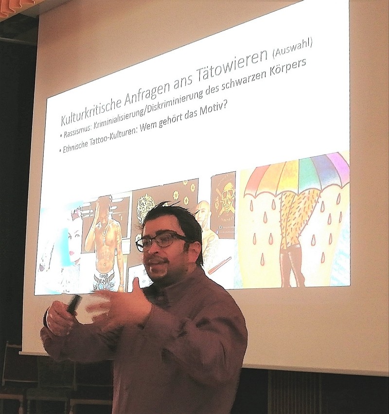 Tattoo-Motive lassen sich z. B. unterscheiden in ethnisch-kulturelle Tattoos, Tattoos aus der LGBT-Szene und Tattoos, die etwas über die jeweilige Sozialisierung oder Religion (Körper als Ort der Gottesbegegnung) aussagen. Den Schwerpunkt seines Vortrags legte C. Campbell auf die für viele ungewöhnlich klingende Kombination von religiösen Motiven und Tätowierkunst. Bereits seit Jahrhunderten lassen sich Menschen am Ende einer Pilgerreise ein religiöses Symbol unter die Haut stechen.