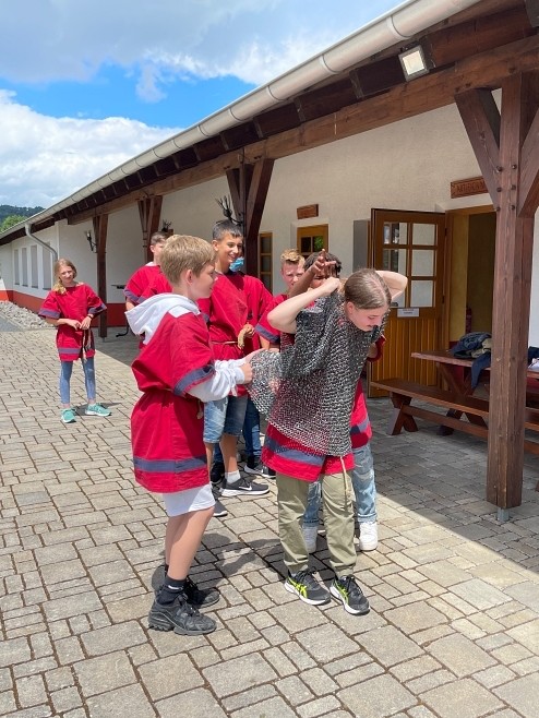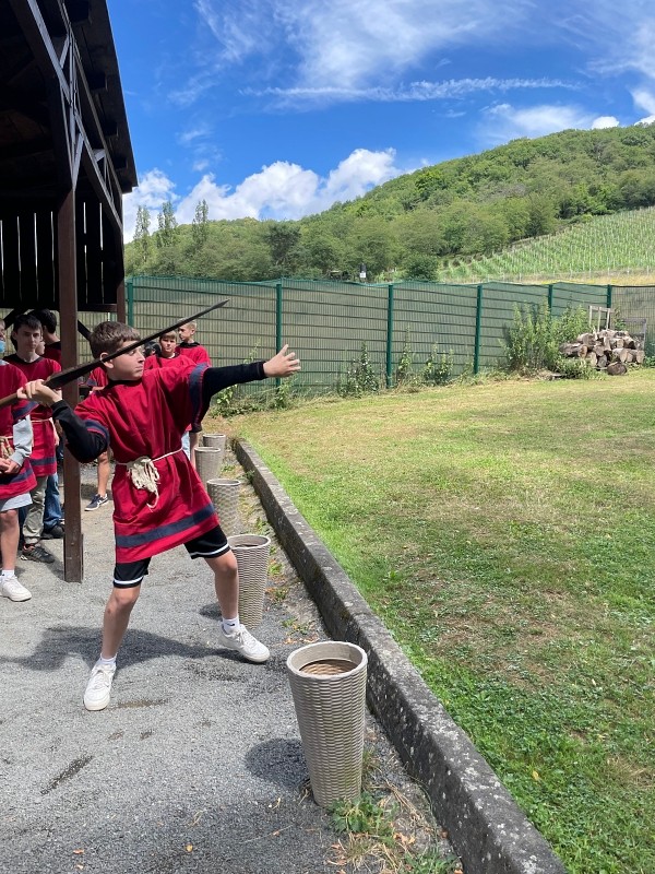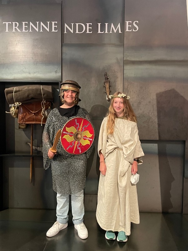 Gut gelaunt starteten wir ins Erlebnismuseum „RömerWelt am Caput Limitis“ (Anfang des Obergermanischen Limes) in Rheinbrohl. Im antiken Rom angekommen legten wir sofort mit einer Rundführung im Innenbereich der Anlage los. Herr Frosch, der uns in Empfang genommen hatte, stellte sich als ehemaliger Lateinlehrer vor und erklärte uns etwas über die römischen Legionen und über einzelne Soldaten, auch miles genannt, sowie die Waffen der damaligen Zeit. Bei der Tour durften wir außerdem eine schwere Kettenrüstung anziehen. Solche wurden in den früheren Kriegen getragen und wogen ganze 15 kg. Nachdem wir die Rundführung beendet hatten, durften wir uns erst mal in Ruhe im Außenbereich umsehen. Dabei entdeckten einige von uns das antike Gesellschaftsspiel „Rundmühle“. Das ist ein einfaches Spiel, das man eigentlich überall ohne großen Aufwand spielen kann. Man ritzt das Spielfeld einfach auf ein Stück Holz und benötigt drei helle und drei dunkle Steine, die von den Spielern abwechselnd gesetzt werden. Dann wird im Wechsel gezogen, bis ein Spieler eine Mühle mit seinen drei Steinen bilden kann. Das heißt, die Steine einer Farbe müssen in einer Reihe liegen.Nachdem wir uns im Außenbereich mit einer kleinen Rast gestärkt hatten, traten wir in 3er-Gruppen eine Rallye an, in der wir das Außengelände nochmal gründlich erkunden mussten und vieles über das Leben der Soldaten, den Brückenbau, das Fischen und vieles mehr erfahren haben.Nachdem jede Gruppe ihre Rallye abgeschlossen hatte, teilten wir uns pro Klasse in jeweils zwei Gruppen auf um gegeneinander anzutreten.Bei diesem Wettkampf mussten wir uns in verschiedenen Disziplinen behaupten. Insgesamt gab es vier Spiele. Bei den ersten drei Spielen hatten wir jeweils 10 Minuten Zeit um so viele Punkte wie möglich zu erzielen.Das erste Spiel bestand darin, das Kettenhemd so oft wie möglich an- und wieder auszuziehen. Dabei hatten die Teams unterschiedliche Taktiken und es wurde viel gelacht.Beim zweiten Spiel mussten wir einen römischen Speer (pilum) über eine bestimmte Grenze werfen. Einige schafften dabei beachtliche Ergebnisse. Aufgabe des dritten Spiels war es, kleine Kugeln so zu rollen, dass sie in die Felder mit den meisten Punkten gelangten. Im vierten und letzten Spiel ging es darum, so schnell wie möglich zu rennen, um die meisten Punkte zu ergattern.Nach dem Wettkampf wurde der Sieger ernannt und später wurde uns im Unterricht allen noch ein DIPLOMA ausgehändigt. Bis unser Bus um 14 Uhr wieder Richtung MTG fuhr, hatten wir noch etwas Zeit, die von uns ganz unterschiedlich genutzt wurde. Einigen hatte es das Spiel Rundmühle angetan, andere enterten den Spielplatz oder schauten sich nochmal auf den Spuren der Römer um.