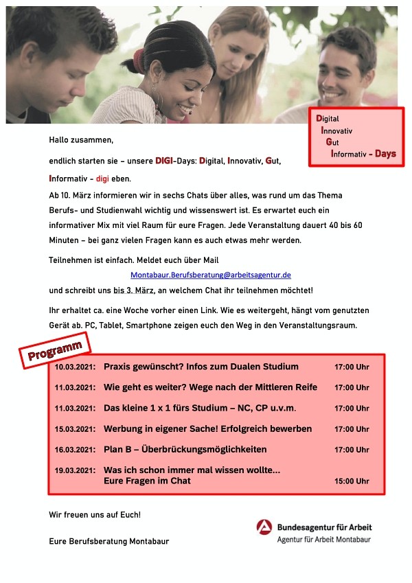 Die Agentur für Arbeit Montabaur bietet ab 10.3.21 die so genannten „Digi-Days“ an.