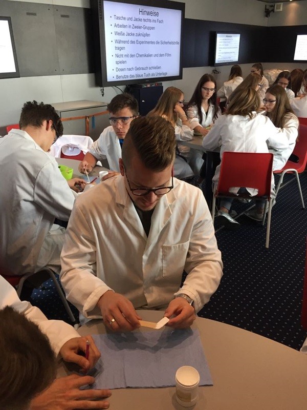 Auf den Bildern sieht man zum einen den Truck in voller Größe und zum anderen die Klasse 10f, welche im Truck zusammen mit ihrem Lehrer Herrn Jösch experimentierte. Dabei sei noch erwähnt, dass Herr Jösch selbst bereits 2009 den Truck als Schüler besuchte :-)