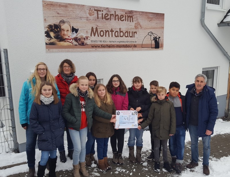 Herr Lind, der Leiter des Tierheims Montabaur, nahm die Spende am 31. Januar von den Teilnehmern der AG entgegen. Diese waren bei herrlichstem Winterwetter mit ihren zwei AG-Leiterinnen zum Tierheim marschiert, wo Herr Lind sie noch einmal durch das Katzenhaus und zu den Kaninchen führte und ihnen die zum Teil traurigen Geschichten der Hunde erzählte. Außerdem bedankte er sich ganz herzlich bei den Kindern für ihr Engagement und die Spende.Auch wir bedanken uns beim Team des Tierheims dafür, dass wir auch in Zukunft bei ihnen willkommen sind, um mit den Hunden und Katzen zu spielen, die Esel oder Ponys zu striegeln oder die Ziegen und das Hängebauchschwein zu füttern.