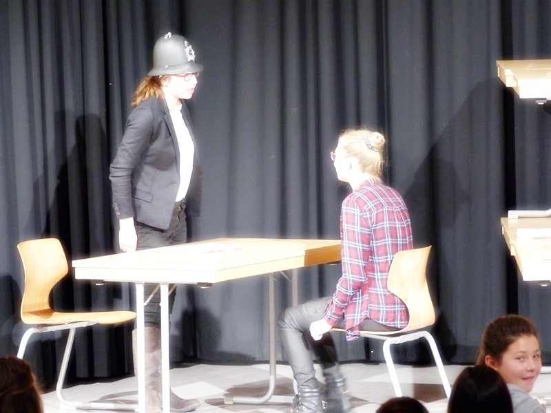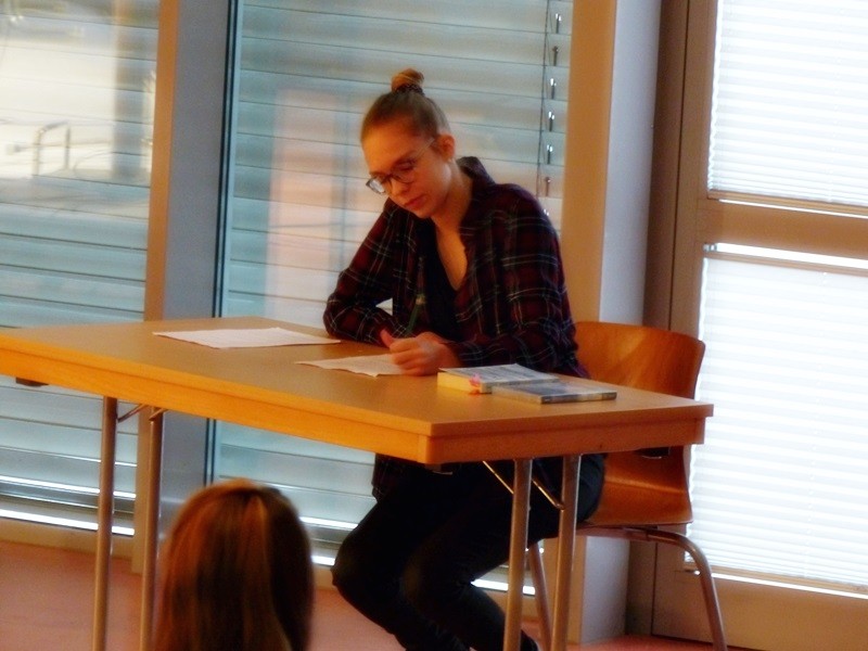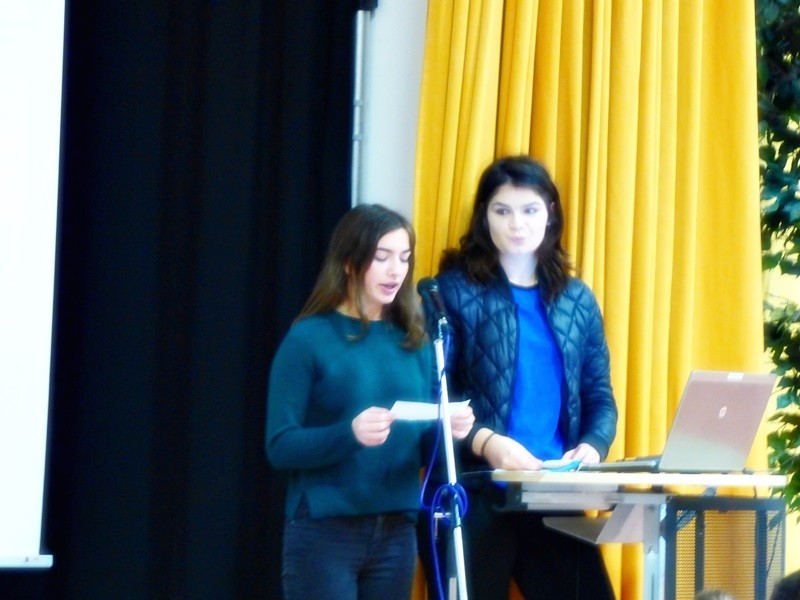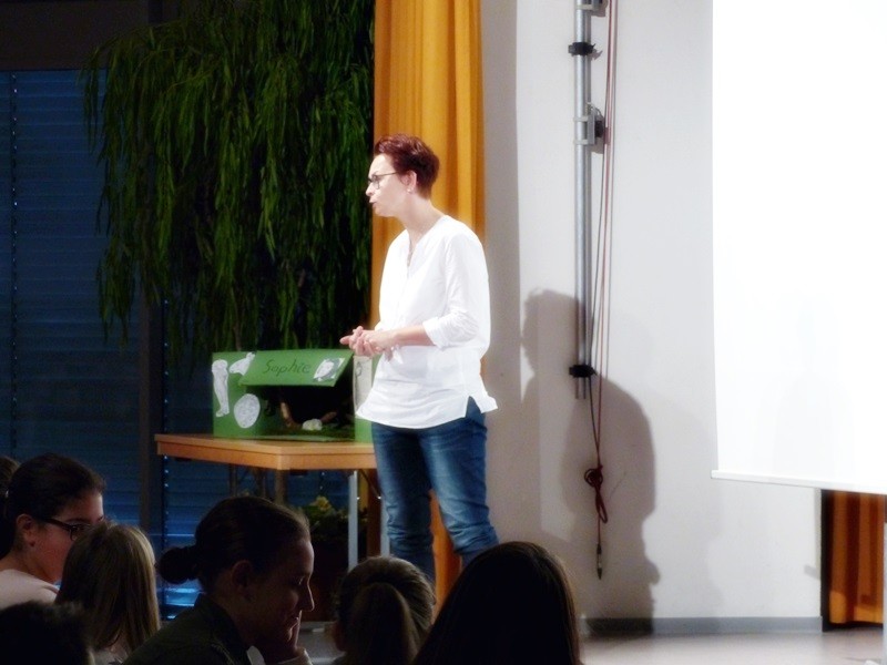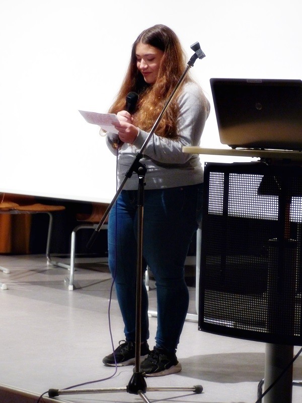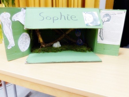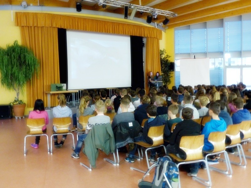 Der erste Projektbeitrag war ein von zwei Zehntklässlerinnen gedrehter, sehr tiefgreifender Filmbeitrag über das Buch „Ich bin ein Stern“ von Inge Auerbacher. Es folgte – auf Basis der Tagebucheinträge von Sophie Scholl – ein (fiktives) Interview zwischen Autor und Angehörigen. Ergänzt wurde diese Buchvorstellung durch eine Lesekiste: In einem besonders gestalteten Karton fanden sich Gegenstände, die etwas mit dem Leben der Sophie Scholl zu tun hatten. Ein weiterer Filmbeitrag über den Roman „Die Brücke“ stimmte die Siebtklässler einerseits nachdenklich, andererseits aber begeisterte er sie auch… möglicherweise durch die ausgezeichnete schauspielerische Leistung dreier Schüler. Besonderes schauspielerisches Talent konnte man auch in der vierten und letzten Projektvorstellung erkennen: Vier Schülerinnen schrieben (und spielten) ein kleines Theaterstück auf Grundlage des Jugendromas „Der Junge im gestreiften Pyjama“.