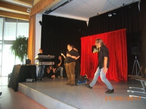 Allerdings handelte es sich hierbei nicht um ein klassisches Bühnenstück, sondern um sogenanntes Improvisationstheater. Die Schauspieler spielen eine Situation, die auf spontanen Vorschlägen des Publikums aufbaut. So bat die Theatergruppe zum Beispiel darum, Lokalitäten in den Raum zu rufen, an anderer Stelle darum, Sätze der Schauspieler zwar sinnvoll, aber lustig zu vollenden. Dabei war es der Gruppe wichtig, keine Begriffe aus dem Themenbereich Sucht zu verwenden, weil diesem in der nachfolgenden Fragerunde noch zur Genüge Beachtung geschenkt werden würde.