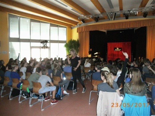 Das Besondere an der Theatergruppe Requisit ist, dass alle Mitglieder mit Ausnahme der Gruppenleiterin Nora einst suchtmittelabhängig waren und erst nach erfolgreich durchlaufener Therapie zu RequiSIT gefunden haben. Nach zwei Schulstunden ging es dann zurück in die Klassenräume, wo uns zwei Mitglieder der Theatergruppe erwarteten. Diese forderten uns auf, uns nicht zu scheuen auch persönliche und unangenehme Fragen zu ihrem Leben zu stellen, und so erfuhren wir in den nächsten 90 Minuten von schockierenden Ereignissen aus der Drogensuchtlaufbahn beider Mitglieder. Sie erzählten uns, dass beide bereits in ihrer Jugend in Kontakt mit Drogen kamen und nach und nach einer heftigen Sucht zum Opfer fielen, welche sie viele private Kontakte, ihr Zuhause und zunächst auch ihre Aussicht auf berufliche Karriere kostete. Nach mehreren Anläufen gelang es ihnen schließlich, clean zu bleiben. Sie warnten uns davor bestimmte Drogen als weniger gefährlich anzusehen als andere. Gerade dieses Unterschätzen ende schnell in einer Sucht.