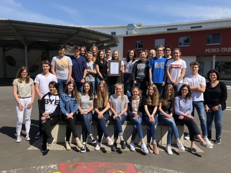 Einen dieser Lösungsansätze - „Green Break at MTG“ (entwickelt von Laura Blaum, Jana Bruch, Sophia Döll, Emily Fender, Deborah Lopp und Celine Weimer) – reichte die Gruppe beim abschließenden Going Green-Wettbewerb ein. Die Schülerinnen wollten etwas auf Schulebene bewegen und erstellten ein Konzept zur Müllreduzierung am MTG. Diese Idee überzeugte nicht nur die Klasse, sondern auch die Jury. Die gesamte Klasse 9b wurde zur Preisverleihung nach Frankfurt eingeladen und durfte dort, in Begleitung von Herrn Breuer, an einer internationalen Tagung zum Thema „Nachhaltige Mobilität“ teilnehmen.
