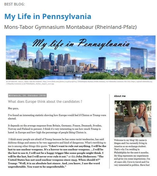 Einer dieser Beiträge hat nicht nur den Kurs, sondern auch die Juroren besonders beeindruckt: Megan Kürsten gewann mit ihrem Beitrag „My life in Pennsylvania“ in der Kategorie „Best Blog“.
