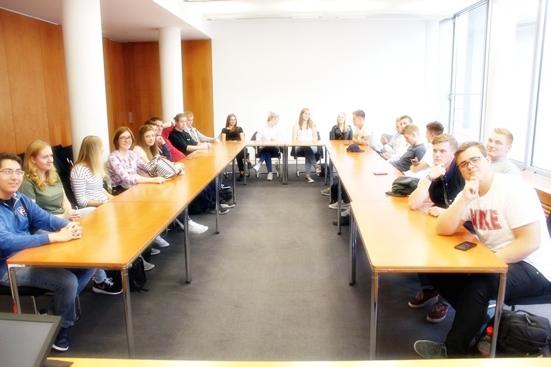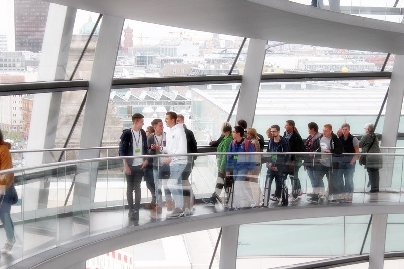 Unser nächstes Hostel lernten wir erst abends kennen, vorher luden wir unser Gepäck in den Bus, der uns ins Stadtzentrum fuhr, von wo aus wir zunächst in einem kleinen Rundgang Sehenswürdigkeiten wie das Brandenburger Tor, das Holocaust-Mahnmal oder den Checkpoint Charlie abklapperten. Nachmittags stand dann unser erster Hauptprogrammpunkt an: zunächst war ein Treffen mit der Westerwälder SPD-Bundestagsabgeordneten Gabi Weber im Paul-Löbe-Haus des Bundestages geplant, die aufgrund einer Erkrankung aber ihren Mitarbeiter Roland Hergesell schicken musste – was für uns etwas schade war, da wir gerne die Abgeordnete selber getroffen hätten. Trotzdem wusste uns Herr Hergesell einiges aus dem Alltag des Berliner Politikbetriebs zu berichten. Anschließend begaben wir uns zum Reichstagsgebäude, wo wir auf der Besuchertribüne des Plenarsaals einem äußerst interessanten Vortrag zur Arbeitsweise des Bundestages lauschten und zum Abschluss Dachterrasse und Kuppel des Reichstags besichtigen konnten. Den Abend verbrachten wir, nachdem wir in unser zweites Hostel – was übrigens qualitativ auch deutlich mehr überzeugte als das erste – eingezogen waren, in kleinen Gruppen auf eigene Faust in der Stadt.