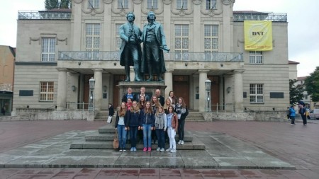 Am Donnerstag, dem 29.09.2016, nach der sechsten Stunde, entschlossen sich zehn mutige Mädchen (Anika Knopp, Birka Kallenbach, Edita Islami, Felisa Barba Meuer, Gina Kollig, Laura Münz, Luisa Normann, Luisa Schmidt, Saskia Best, Saskia Reinemann) und zwei begeisterte Buben (Balthes Meyer, Konstantin Neyer) aus der 13. Jahrgangsstufe mit zwei lieben Lehrern ( Carina Steines, Martin Ehmer) auf Exkursion nach Weimar zu fahren. Doch was verbirgt sich hinter der Stadt, die so bekannt ist für ihre vielen bekannten Kinder wie z.B. Johann Sebastian Bach, Friedrich Schiller, Johann Gottfried Herder und Johann Wolfgang von Goethe? Um das herauszufinden, entschieden sich die Schülerinnen und Schüler für eine Exkursion nach Weimar.