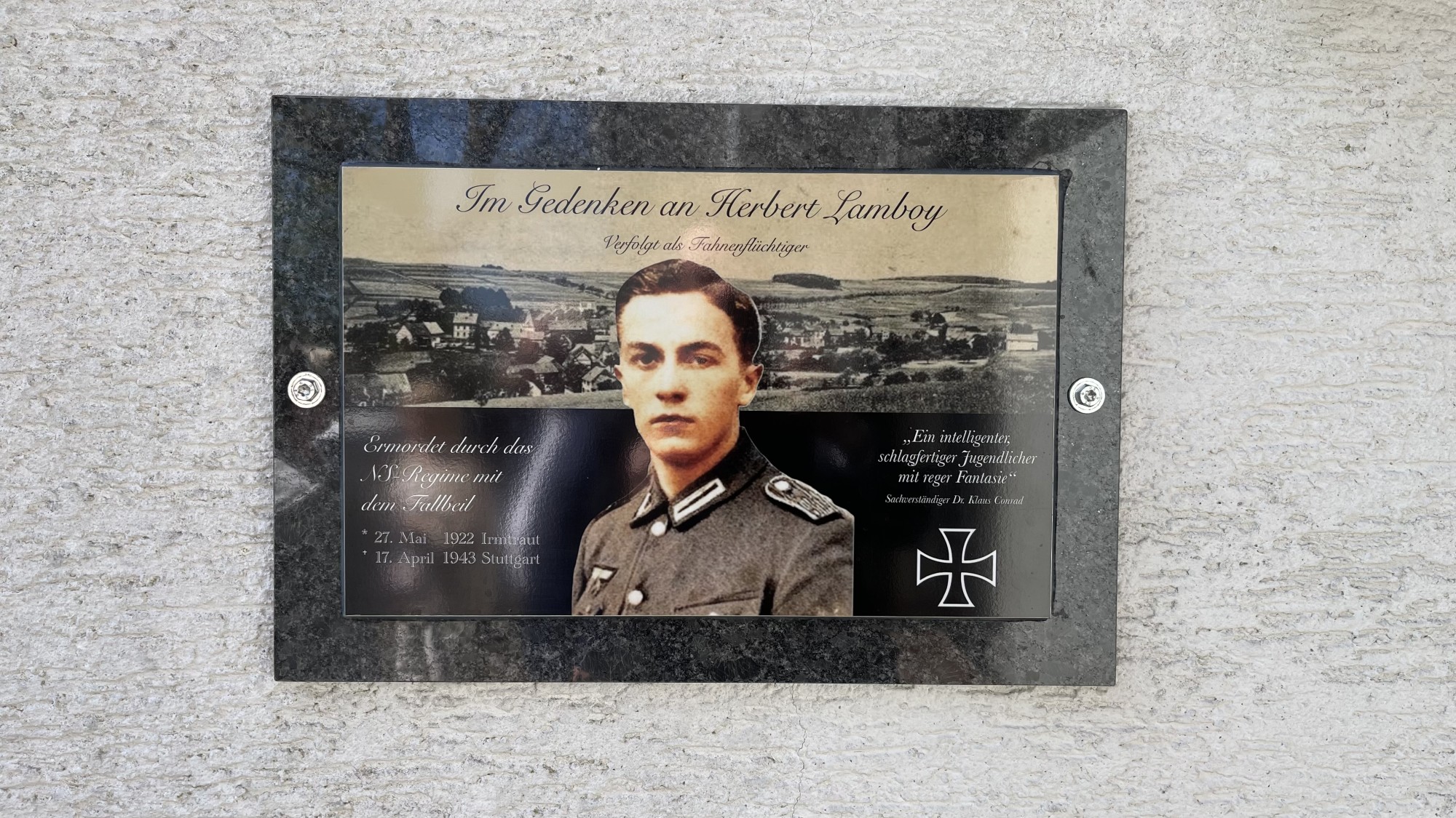 In einem feierlichen und würdevollen Rahmen wurde am 25. April 2026 in Irmtraut eine Gedenktafel für Herbert Lamboy (1922–1943) eingeweiht. Der junge Mann war während der Zeit des Nationalsozialismus in Stuttgart wegen Fahnenflucht mit dem Fallbeil hingerichtet worden. Die neue Erinnerungstafel setzt ein sichtbares Zeichen gegen das Vergessen und würdigt sein kurzes, tragisches Leben.