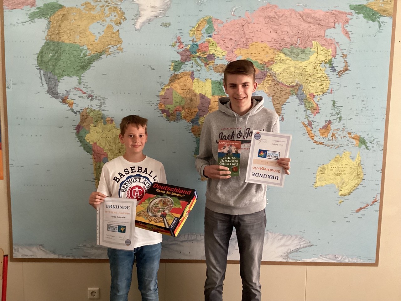 Im Rahmen der Geographischen Tage erhielten auch die diesjährigen Sieger im Wettbewerb Diercke Wissen ihre Urkunden und Preise. Janos Schnelle (6f) und Simon Neust (10b) errangen in ihren Altersklassen die höchsten Punktzahlen und freuten sich vor der neuen Posterweltkarte im Erdkunderaum über ihre Auszeichnungen. Der Fachbereich Erdkunde dankt der Malerwerkstatt Andreas Hess ganz herzlich, dass wir die Weltkarte nun im Unterricht nutzen können.
