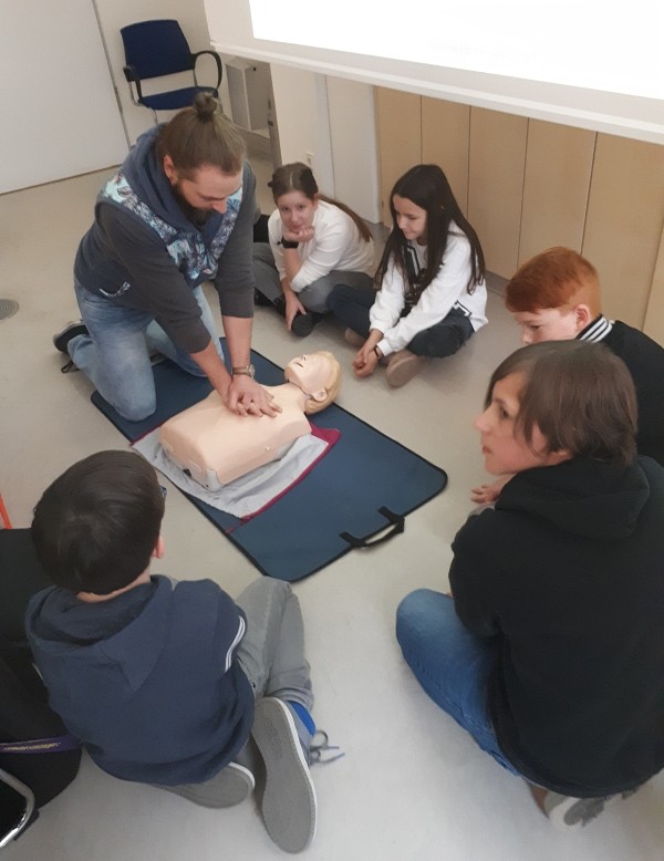 Außerdem erklärte man uns einiges über das Herz. Letztendlich zeigte man uns, wie man einen Menschen wiederbelebt. Wenn man auf der Straße oder irgendwo anders einen Menschen leblos auf dem Boden liegen sieht, dann sollte man zuerst versuchen, die am Boden liegende Person auf sich aufmerksam zu machen. Falls das nicht klappen sollte, dann legt man ein Ohr an den Mund des Bewusstlosen und schaut, ob sich der Brustkorb hebt und senkt. Wenn das nicht der Fall ist, ruft man den Rettungsdienst an, der unter der Nummer 112 zu erreichen ist.