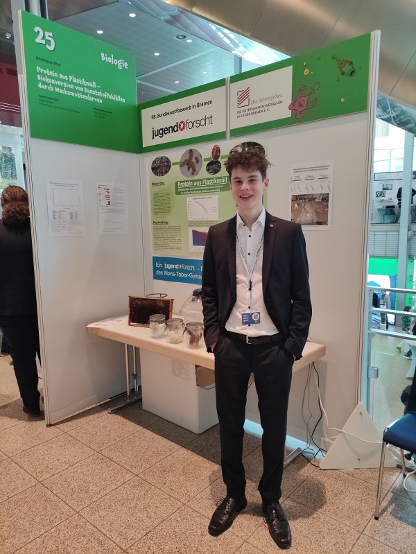 Er machte sich schon früh morgens auf den Weg nach Bremen zum Höhepunkt der diesjährigen Jugend-forscht-Wettbewerbsrunde. In Bremen fand in den nächsten vier Tagen der Bundeswettbewerb statt und Julian hatte sich mit seinem Projekt zur “Biokonversion von Plastik durch Wachsmottenlarven” in den vorangegangen Wettbewerbsrunden für eine Teilnahme qualifiziert (wir berichteten).