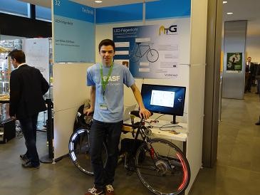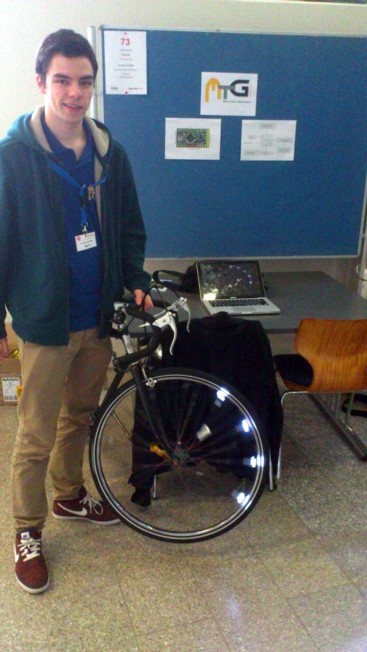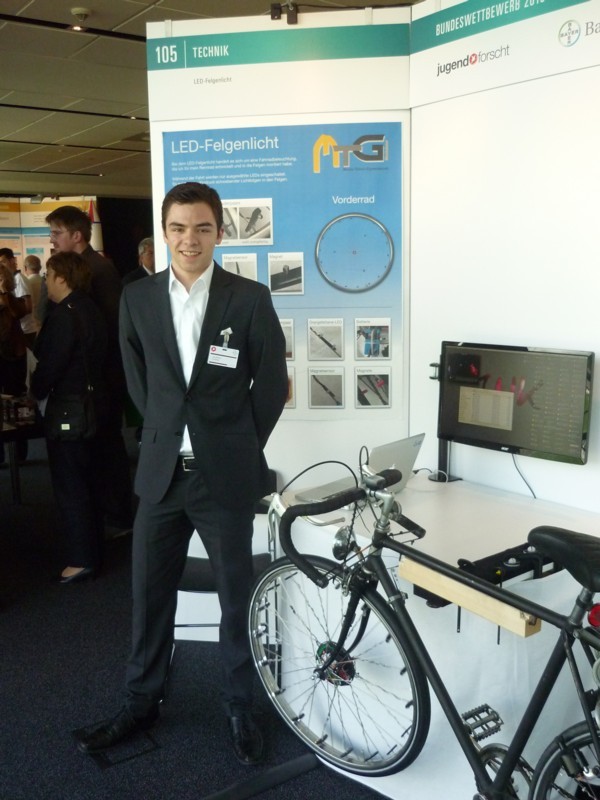 Als Belohnung für die hervorragenden Leistungen beim Regional- und Landeswettbewerb durfte Jan-Niklas Kohlhaas (Abitur 2013) vom 30.5. bis 2.6. am Bundeswettbewerb in der BayArena Leverkusen teilnehmen. Wie in den Runden zuvor verbesserte er sein LED-Felgenlicht noch einmal, z.B. durch eine direkte Steuerung der LED durch eine Handy-App und durch eine selbst konstruierte Befestigung für die LED an der Felge, die er dann mit einem 3D-Drucker auch noch selbst herstellte.