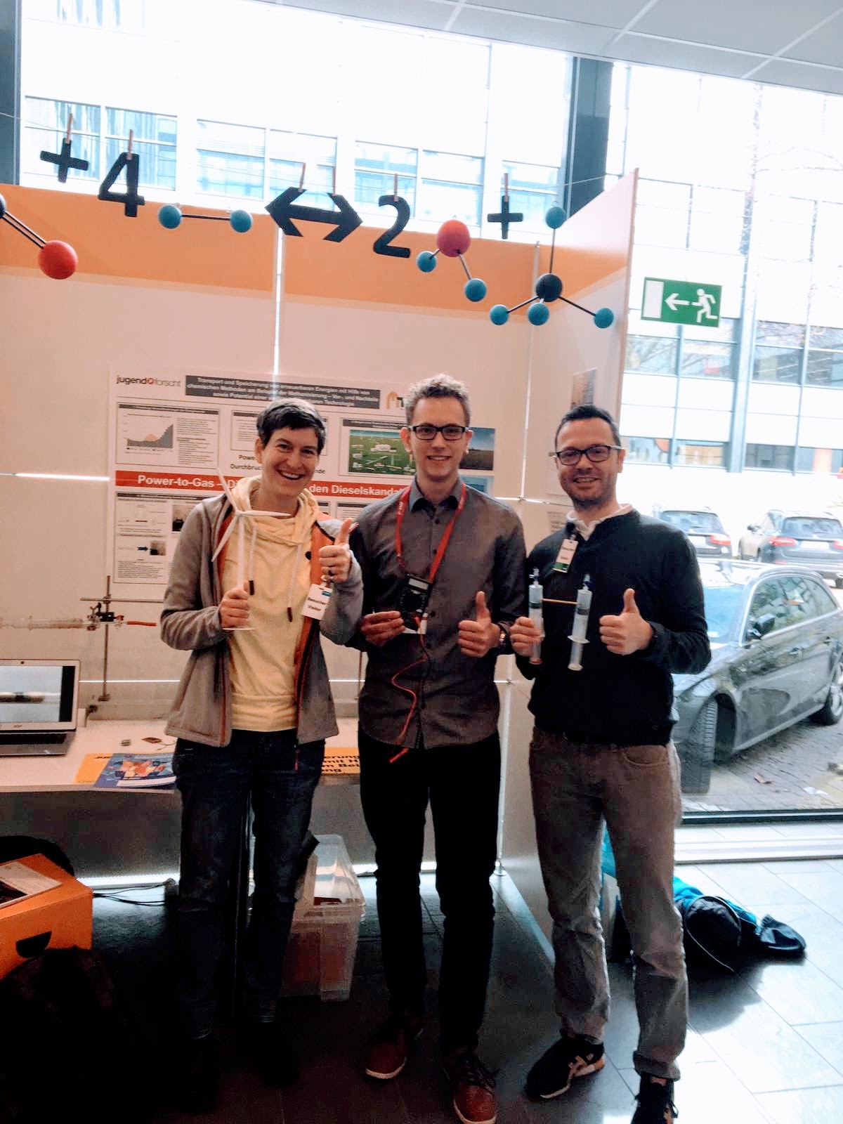 Auf der Sonderpreisverleihung am Mittwoch waren beide Projekte erfolgreich: Oliver hat ein Praktikum am Deutschen Zentrum für Luft- und Raumfahrt in Braunschweig gewonnen. Dieses findet diesen Sommer statt, was auch leider der Grund dafür ist, dass Jonas den Preis leider nicht in Anspruch nehmen kann. Er möchte zu diesem Zeitpunkt gerade mit einer Ausbildung starten. Abräumer des Abends aus Sicht des MTG war unser Abiturient Tim. Er sicherte sich gleich drei Sonderpreise:1. Sonderpreis: Wasserstoff, Brennstoffzelle und batterieelektrische Antriebe, Preisstifter: NOW GmbH - Nationale Organisation Wasserstoff- und Brennstoffzellentechnologie, 250€2. Sonderpreis Erneuerbare Energien, Preisstifter: Bundesministerium für Wirtschaft und Energie, 250€3. Buchpreis für den schönsten Stand, Preisstifter: BASF SE