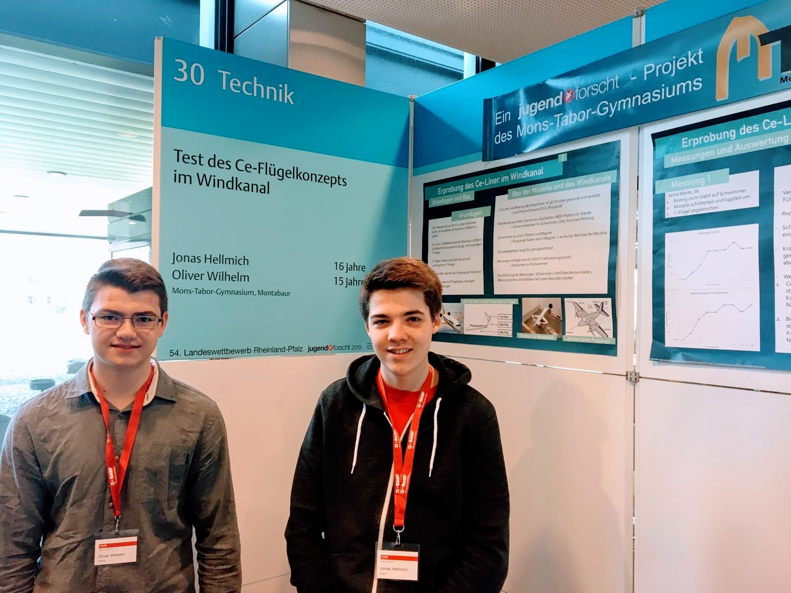 Und tatsächlich sollten sich die Hoffnungen auf einen Sieg an diesem Tag noch bestätigen: Unser Abiturient Tim Bender gewann mit seinem zukunftsorientierten Projekt „Transport und Speicherung von erneuerbaren Energien mit Hilfe von chemischen Methoden am Beispiel der Methanisierung“ den herausragenden ersten Platz in der Kategorie Chemie. Er überzeugte mit diesem auf Nachhaltigkeit basierendem Projekt die Fachjury und wurde sogar noch mit dem Sonderpreis „Erneuerbare Energien“ ausgezeichnet. Und damit nicht genug: Einen weiteren ersten Platz und damit eine weitere Teilnahme am Landeswettbewerb in Ludwigshafen (BASF) vom 26.03.19 bis zum 28.03.19 erzielten unsere beiden Schüler Jonas Helmich und Oliver Wilhelm (beide NAWI 10). Sie testen in ihrer Arbeit das Ce-Flügelkonzept der Firma Bauhaus Luftfahrt in einem selbstgebauten Windkanal unter standardisierten Bedingungen. Die Flugzeugmodelle, insbesondere die unterschiedlichen Flügel, wurden mit dem 3d-Drucker unserer AG ebenfalls selbst hergestellt. Damit endete unser zweiter Wettbewerbstag in Remagen überaus erfolgreich!