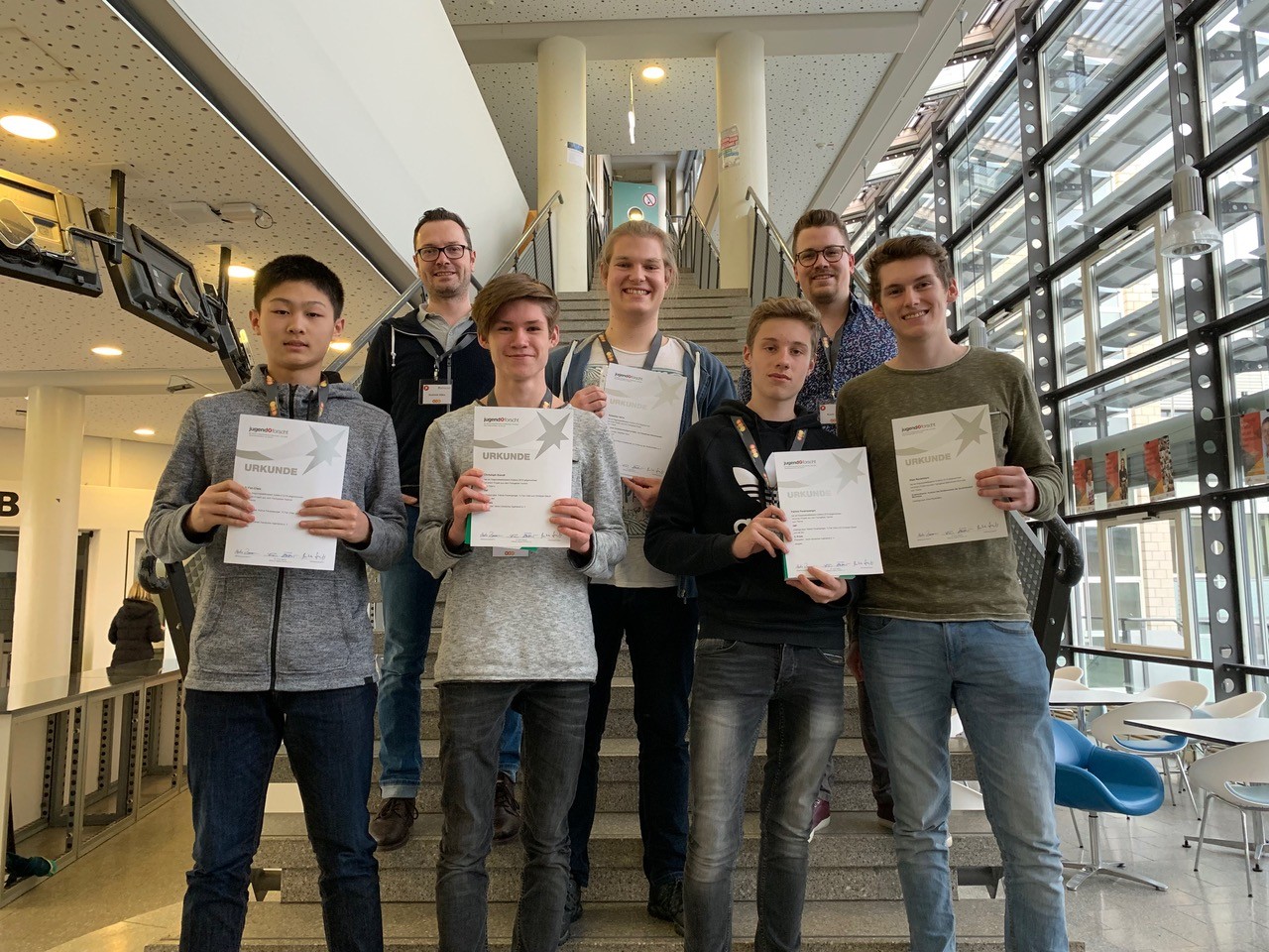 Los ging es am Samstag, den 09.02.19, auf dem größten regionalen Wettbewerb an der Hochschule auf der Karthause in Koblenz. Dort präsentierten Yifan Chen, Patrick Feuersänger und Christoph Staudt (alle NAWI 10) ihre selbstgebaute Teslaspule. Sie überzeugten die Jury und sicherten sich den 3. Platz in der Kategorie Technik. Zusätzlich erhielten sie den Buchpreis der Jury. Elias Reutelsterz (13) erzielte in Kategorie Mathematik / Information eine Urkunde für seine erfolgreiche Teilnahme mit seinem Projekt „Graphentheorie: Analyse des Straßennetzes der Quadratestadt Mannheim“. Sebastian Heins war für das MTG der Abräumer des Tages: Zwar reichte es ganz knapp nicht für den Sieg, allerdings für den mehr als respektablen zweiten Platz in der hart umkämpften Kategorie Physik. In seinem Projekt beschäftigte er sich mit künstlichen Muskeln aus Nylon und deren Eigenschaften. Dabei ließ er wie von Zauberhand die selbstgebauten künstlichen Muskeln durch Anlegen einer 9V-Spannung kontrahieren und wieder entspannen. Neben dieser ausgezeichneten Platzierung erhielt er zusätzlich den Sonderpreis für zerstörungsfreie Prüfung. Eine klasse Leistung und ein toller Tag für unsere Teilnehmer in Koblenz!