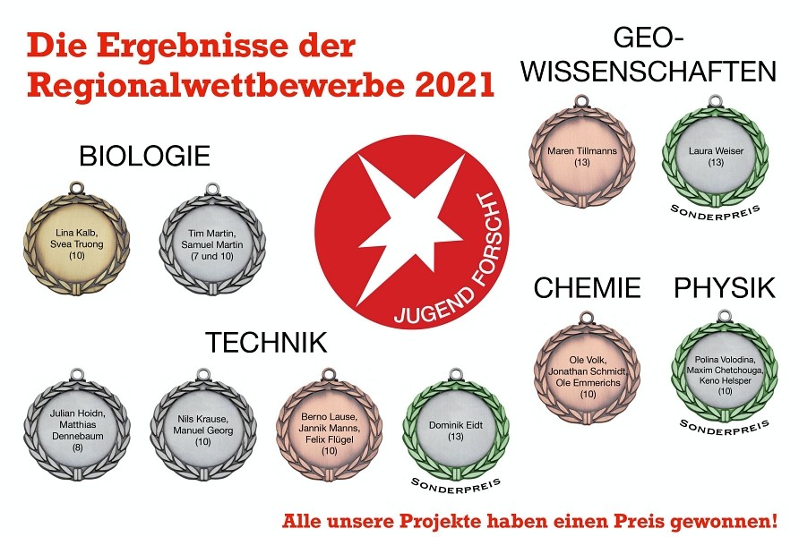 Anders als in früheren Jahren mussten die Jurygespräche von zuhause aus oder aus einem Raum der Schule mittels Videokonferenz stattfinden. Leider entfiel dadurch auch der wertvolle und gewinnbringende Kontakt zu den anderen Teilnehmerinnen und Teilnehmern auf den einzelnen Wettbewerben. Unsere Schule ging mit der bemerkenswerten Anzahl von insgesamt 10 Projekten an den Start. Unter den aktuellen Bedingungen war allein diese Menge alles andere als selbstverständlich. Damit gehörten wir auch in diesem Jahr zu den Schulen mit den meisten Projekten und der größten Anzahl an daran beteiligten jungen Forscherinnen und Forscher (20).