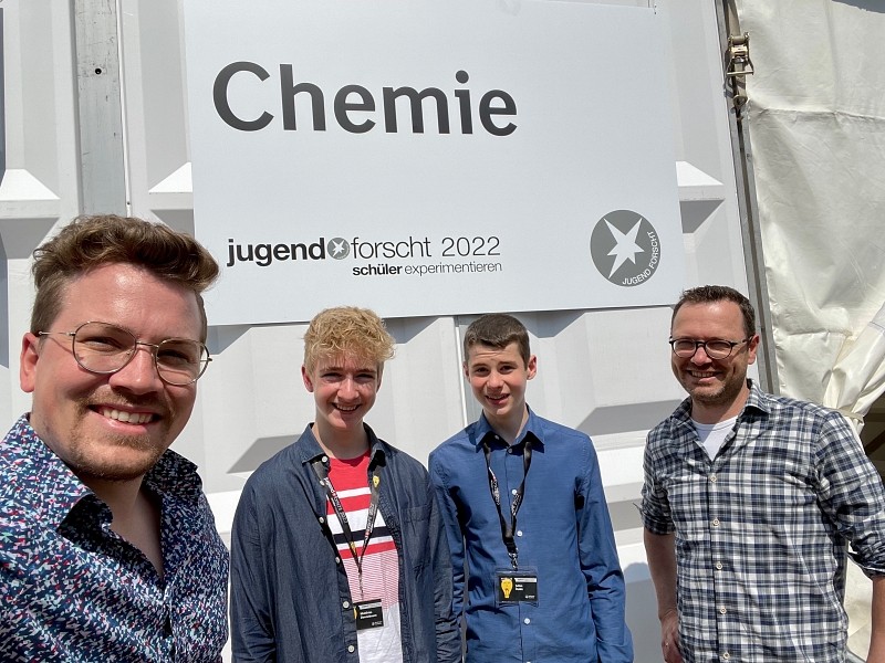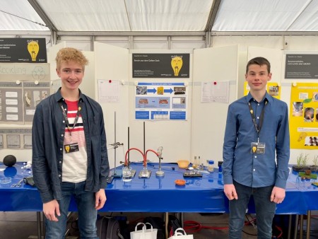 Bei dem Wettbewerb, der am 28.04.2022 auf dem Werksgelände des Konzerns stattfand, konnten sie sich gegen die starke Konkurrenz durchsetzen und mit ihrem Projekt „Benzin aus dem gelben Sack“ die Jury vollends überzeugen. In ihrer Laudatio zum Landessieg war die Jury voll des Lobes für die beiden und betonte deren feines methodisches und analytisches Vorgehen.In ihrem Projekt gelang es den beiden, aus herkömmlichen Plastikabfällen mittels eines Thermomix, eines Perlkatalysators und einer Destillationsanlage brennbare Gase und Flüssigkeiten zu gewinnen. Die chemische Methode, die dahintersteckt, nennt man „thermisches Cracken“. Die gewonnenen gasförmigen und flüssigen Produkte lassen sich direkt in Verbrennungsmotoren nutzen. Eine Analyse des flüssigen Produkts von Matthias und Julian mittels IR-Spektroskopie bei unserem Partnerunternehmen URSA Chemie Montabaur (vielen Dank!) ergab eine 81%ige Übereinstimmung mit einem synthetischen Benzin namens „White Spirit“. Die beiden haben damit eine äußerst umweltbewusste und nachhaltige Methode zum Recycling von Kunststoffabfällen entwickelt.In ihrem dritten Jugend-forscht-Jahr haben Julian und Matthias bereits zwei erste Plätze und einen zweiten Platz auf der regionalen Ebene, sowie den aktuellen ersten Landessieg auf ihrem Konto. Dies ist schon jetzt eine sensationelle Erfolgsgeschichte! Die beiden sind aber auch weiter mit Feuer bei der Sache und haben bereits auf der Heimfahrt aus Ingelheim neue Ideen für ihreTeilnahme an der nächsten Runde von Jugend forscht gesammelt – dann endlich in der Altersgruppe „Jugend forscht“. Lieber Julian, lieber Matthias, wir sind megastolz auf euer Abschneiden und eure Performance insgesamt. Ihr habt das Mons-Tabor-Gymnasium ganz hervorragend repräsentiert!Damit endet nun endgültig die diesjährige Wettbewerbsrunde für uns und wir starten mit den Planungen für das nächste Schuljahr. Die neuen Termine und alle weiteren Infos werden zu Beginn des neuen Schuljahres an verschiedenen Stellen (Plakate, Homepage, …) zu sehen sein. Wenn ihr Spaß am Experimentieren habt und euch gerne mit anderen über eure (naturwissenschaftlichen, mathematischen, geografischen, ...) Ideen austauschen möchtet, dann seid ihr in der Jugend-forscht-AG genau richtig!