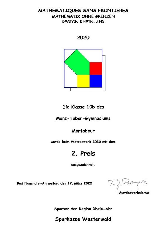 An diesem internationalen Mathewettbewerb nehmen traditionell unsere 10. Klassen und unsere Mathematik-Leistungskurse der Jgst. 11 teil. Die anspruchsvollen und teils sehr komplexen Aufgaben werden in exakt 90 Minuten und unter Einhaltung strenger Regeln von der gesamten Gruppe gelöst. Dabei ist Teamwork der entscheidende Schlüssel zum Erfolg! Mehr Infos zu „Mathematik ohne Grenzen“ kann man hier finden: https://lw-mog.bildung-rp.de/