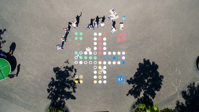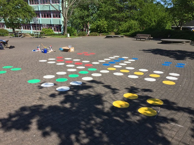 Am 14. Mai war es endlich so weit, das Wetter war sonnig und trocken, somit konnte ich mein Projekt ein „Mensch-ärgere-dich-nicht“ Feld auf den Schulhof zu malen, verwirklichen.