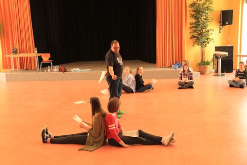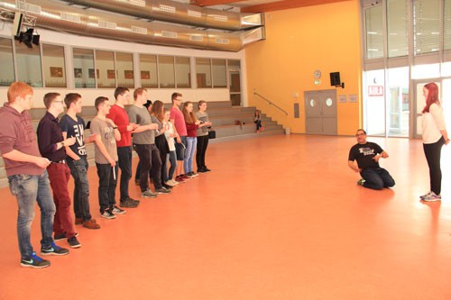 Schon zu Beginn wurde allerdings klar, dass es ihm nicht um die theoretische Erarbeitung des Textes ging: vielmehr wollte er den Schülerinnen und Schülern den Stoff über professionellen Trainingstechniken aus seiner eigenen Schauspielererfahrung näher bringen. Sie sollten sich dabei ruhig „ein bisschen bescheuert“ fühlen, das mache nichts aus – Spaß war also von vornherein garantiert. Nach einer Warm-Up-Session und mehreren Rhythmus-, Sprech- und Klatschübungen ging es schließlich an die Stücke aus dem Unterricht und aus Schülern wurden Kriegsherren, Könige, italienische Fürsten oder auch einfache Hausmädchen aus einem Werk von Shakespeare. D’Silva legte Wert darauf, dass den Schülerinnen und Schülern sowohl die äußere als auch die innere Situation der Figuren klar wurde, und besprach anhand ausgewählter Textbeispiele ausführlich die jeweilige Gefühlslage eines Charakters – nachdem es natürlich vorher in mehreren Übungen veranschaulicht worden war – und auch die jeweils von Shakespeare gesetzten sprachlichen Akzente. Stets gab er sich dabei Mühe, lebendige Beispiele zu finden: Für einen Dialog aus „Romeo und Julia“ zwischen Julia und ihrem Vater sollten sich die Schülerinnen und Schüler etwa einen Streit mit ihren Eltern vorstellen, und den italienischen Fürsten Leonato aus „Much Ado About Nothing“ sollten sie als Mafiaboss betrachten, um sich in seine Lage besser hineinversetzen zu können.