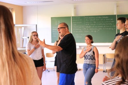 In den Workshops entschlüsseln die Kurse Shakespeares – zugegeben oft sperrige – Sprache mithilfe klassischer Theatertechniken, ganz so wie es Schauspieler bei den Proben eines Stückes tun. Hierbei heißt es vor allem: Get on your feet! Dazu gehören Stimmübungen, das Einstudieren von Bewegungsabläufen und nebenbei, fast ohne es zu merken, wachsen die Kurse zu kleinen Ensembles heran, die am Ende des Workshops ganze Szenen spielen können. Dabei folgen sie Julius’ wichtigster Anweisung: „You have to be ein bisschen bescheuert.“