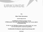 MTG deutschlandweit unter den besten Jugend-forscht-Schulen 2017 Die Erfolge der Vergangenheit und die Ergebnisse in der Wettbewerbsrunde 2016/17 (alle nachzulesen auf unserer AG-Homepage) haben nun dazu geführt, dass unsere Schule für den Sonderpreis „Jugend forscht Schule 2017“ nominiert wurde und sogar in die engere Auswahl kam. Damit zählt das MTG zu den acht besten für den Sonderpreis der ständigen Konferenz der Kultusminister der Länder (KMK) nominierten Schulen. Das Original unserer Urkunde für diese Nominierung kann in dem Glasschaukasten im Eingangsbereich unserer Schule bestaunt …