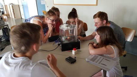 Nach der Mittagspause ging es in Sechser-Gruppen mit Stationenarbeit weiter. Trotz der extremen Temperaturen gaben die Teams ihr Bestes. Station A befasste sich mit Antimaterie. Mithilfe eines Videos von TheSimplePhysics erfuhren wir mehr über den Aufbau und die Entstehung von Antimaterie und diskutierten, wie sinnvoll es ist diese zu erschaffen. Bei Station B befasste man sich mit der linearen Paulfalle. Der wesentliche Unterschied zur selbstgebauten Paulfalle ist, dass hier die Elektronen waagerecht in einem Rauten ähnlichen Tunnel gefangen gehalten werden. Station C ging etwas tiefer auf das Verhalten der Bärlappsporen ein und das damit zusammenhängende Verhältnis der Frequenz, mit der die Sporen von Pol zu Pol gestoßen werden und der Spannung, die an das elektrische Feld angelegt ist, um die Sporen im Feld zu halten. Bei der letzten Station ging es um Äquipotenziallinien im Quadrupolfeld , was auch bei uns für Kopfzerbrechen gesorgt hat.