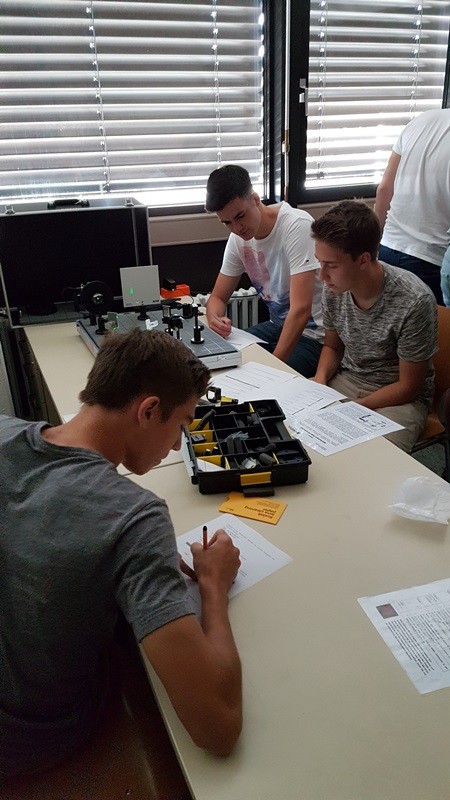 Die Holografie-Gruppe arbeitete in Dreier-Gruppen an verschiedenen Stationen, nachdem man durch einen kleinen Vortrag einen ersten Einblick in die Materie erhalten hatte. Die einzelnen Stationen bestanden aus verschiedenen Versuchen, die den Schülern den Wellencharakter von Licht näher bringen sollten.